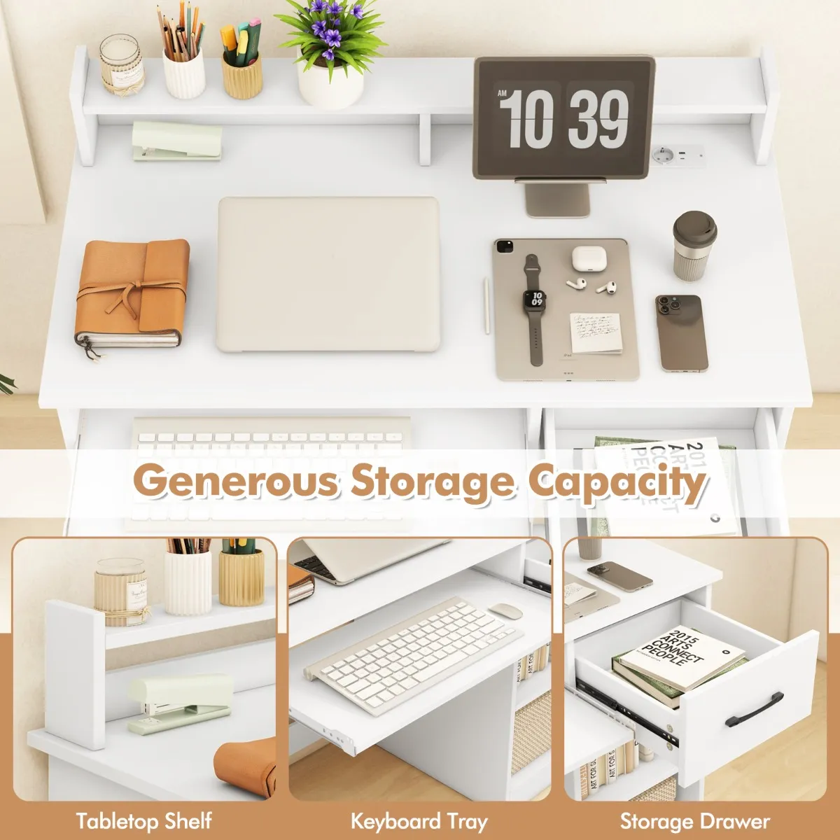 【Ruim werkoppervlak】: Dit moderne bureau heeft een 105 cm breed blad voor maximale werkefficiëntie. Het beschikt over een plank aan de bovenkant, een opberglade en een uitschuifbaar toetsenbordvak, zodat uw ruimte opgeruimd blijft en uw productiviteit toeneemt.