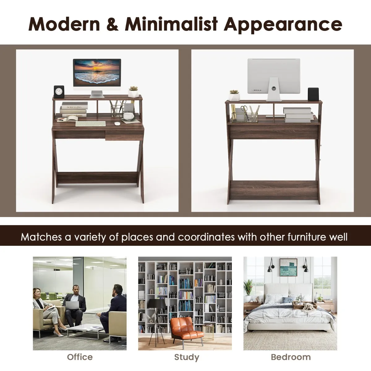 Ruim werkblad en opbergruimte: Het computerbureau beschikt over een groot tafelblad dat voldoende ruimte biedt voor het werken en plaatsen van benodigde voorwerpen. Werkbenodigdheden zoals toetsenbord, notebook en koffiezetapparaat kunnen voor eenvoudige toegang op het tafelblad worden geplaatst. Tegelijkertijd biedt de uittrekbare lade extra opbergruimte voor persoonlijke voorwerpen.