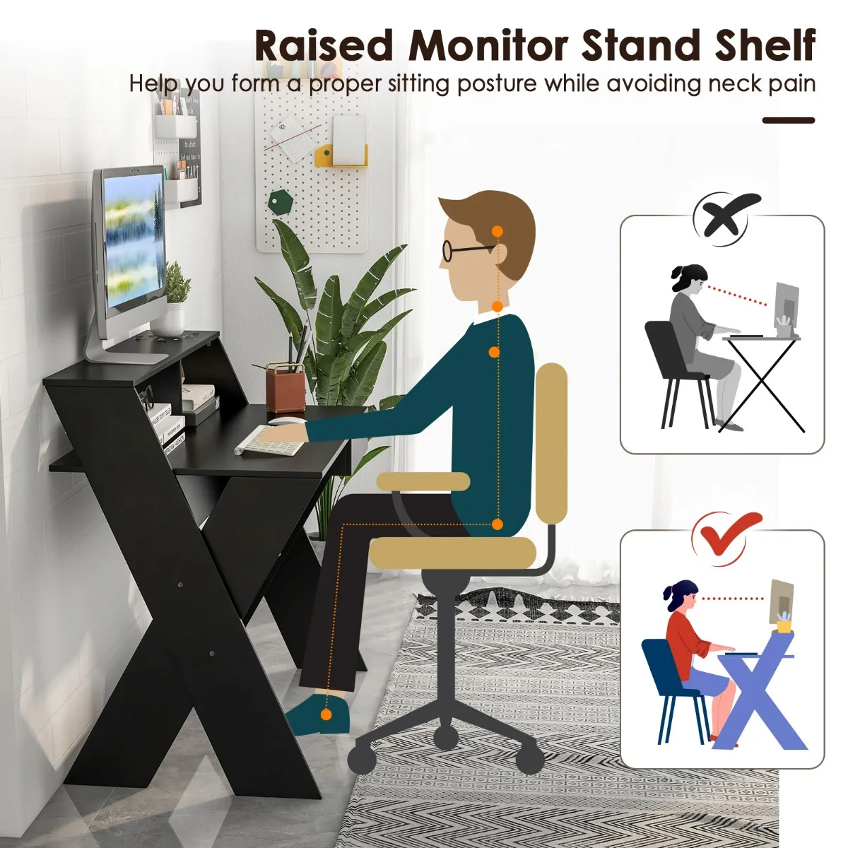 Ergonomische monitorverhoging: Het moderne bureau is uitgerust met een verhoogde monitorstandaard en maakt het mogelijk om op ooghoogte naar de computer te kijken en zo gezonder te werken. De verhoogde monitorplank helpt je om een goede zithouding aan te nemen en tegelijkertijd nekpijn effectief te voorkomen.