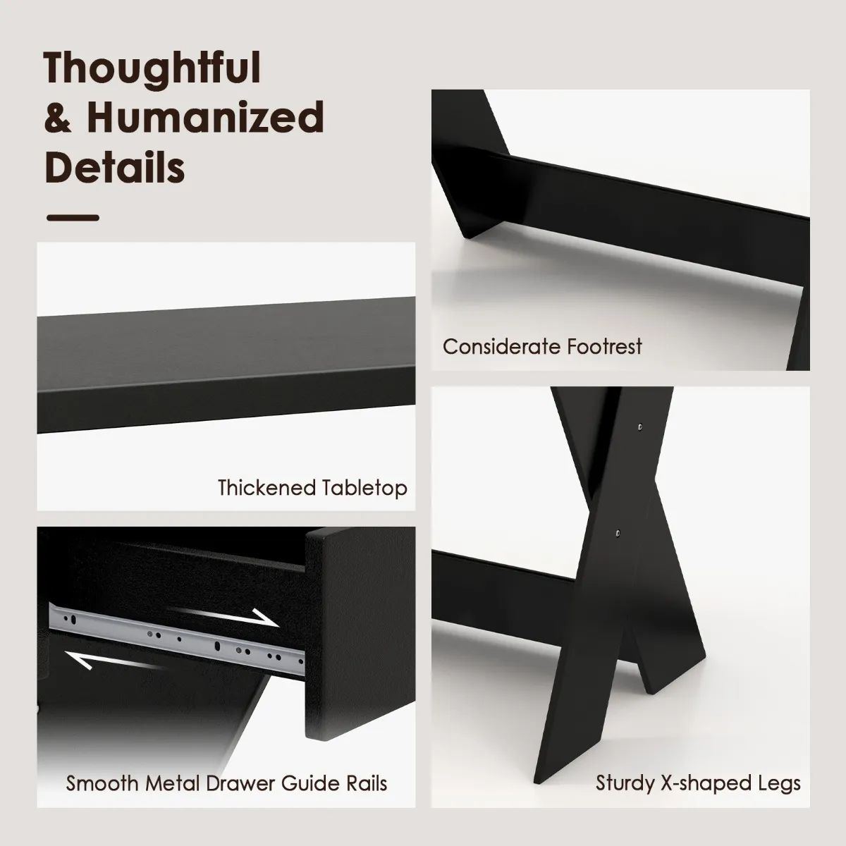 Geselecteerde materialen en stabiele structuur:Â Het bureau bestaat uit hoogwaardige materialen en is ontworpen voor duurzaamheid. Bovendien dragen de verdikte platen bij aan stabiele prestaties in het gebruik. De stabiele X-vormige poten ondersteunen de bureautafel en zorgen voor extra stabiliteit.