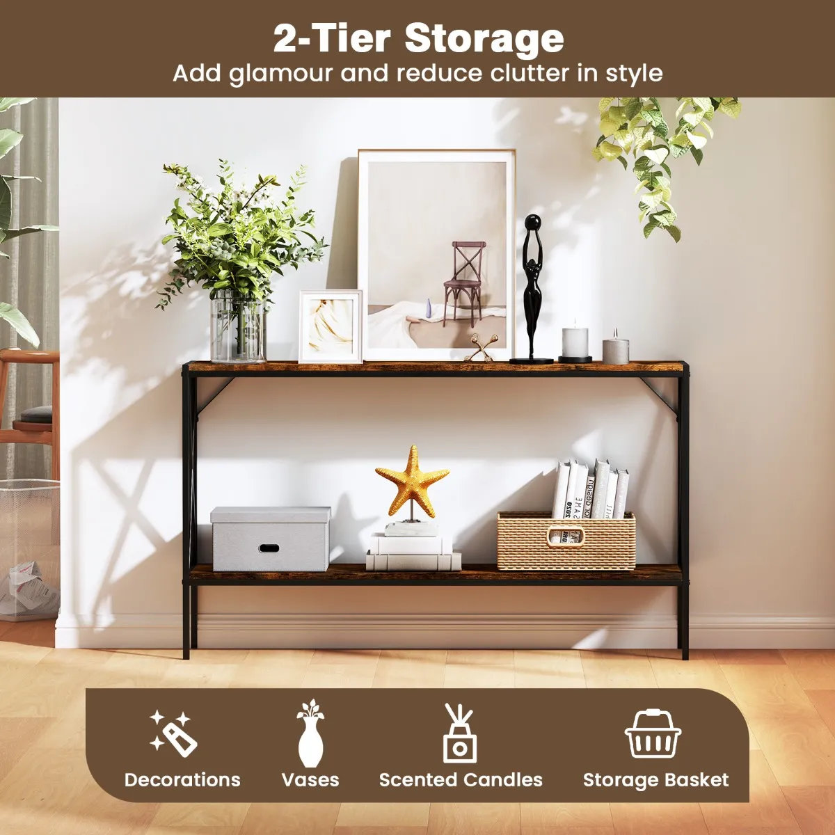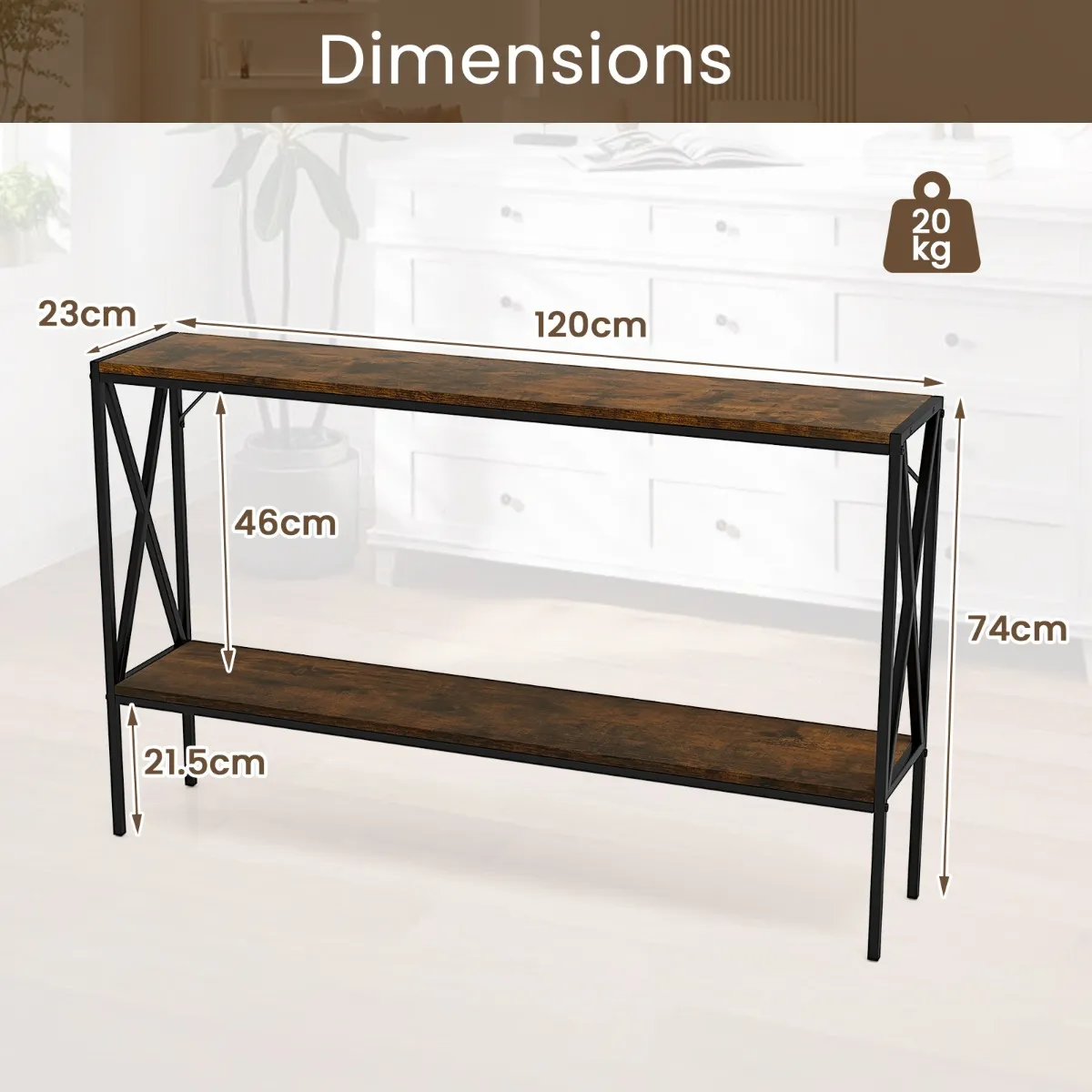 Met de afmetingen 120 x 23 x 74 cm (l x b x h) is de entreetafel zo ontworpen dat hij naadloos in nauwe ruimtes past. De 2-traps foytafel biedt probleemloos ruimte voor decoraties, vazen, geurkaarsen en zelfs opbergmanden, waardoor rommel wordt vermeden en tegelijkertijd de esthetiek van je entree, woonkamer of gang wordt verbeterd. Met een robuust metalen frame en hoogwaardige planken, die door een X-vormige structuur worden gedragen, biedt de haltafel een betrouwbaar platform voor je waardevolle spullen. Overigens verbeteren 2 kantelbeveiligingssets zijn totale stabiliteit verder. Onze smalle salontafel is ideaal voor een stijlvolle organisatie en zal een blikvanger in je woonkamer zijn.