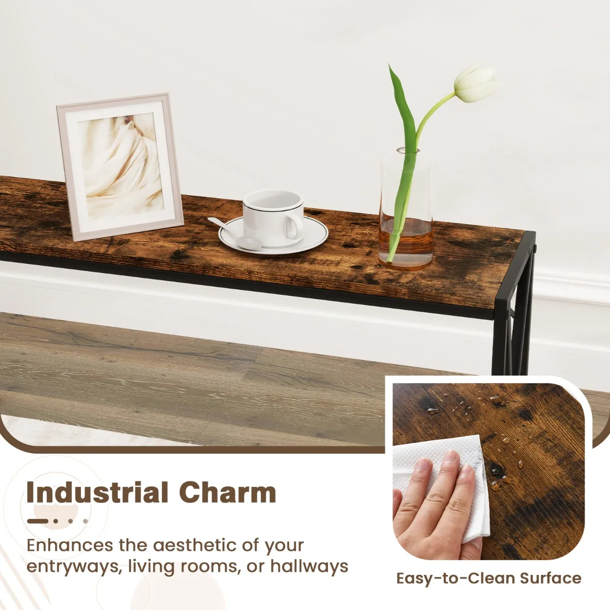 【Industriële charme】: De combinatie van natuurlijke houtnerf en een matzwart metalen frame geeft je woonkamer een vleugje industriële flair. Dit chique design maakt de smalle consoletafel tot een perfecte aanvulling voor zowel rustieke als moderne interieurstijlen.