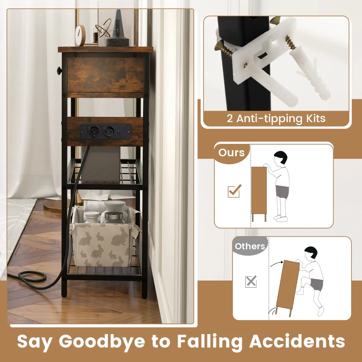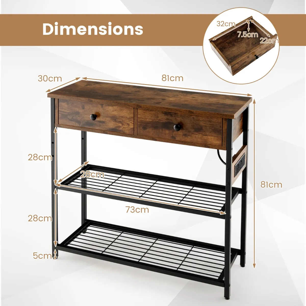 Met zijn elegante design en veel opbergruimte is deze consoletafel perfect geschikt om je persoonlijke stijl tot zijn recht te brengen en je woonkamer op te ruimen. Twee ruime laden en metalen roosterplanken maken een eenvoudige organisatie en toegankelijkheid van je spullen en decoraties mogelijk. Maar dat is nog niet alles: deze bijzettafel is uitgerust met een geïntegreerde stekkerdoos om het opladen van apparaten probleemloos te maken. En de dubbelzijdige installatie van de stekkerdoos maakt het laadstation gemakkelijk te gebruiken. Onze salontafel wordt geleverd met twee anti-kantelsets om een veilige verankering aan de muur te garanderen.