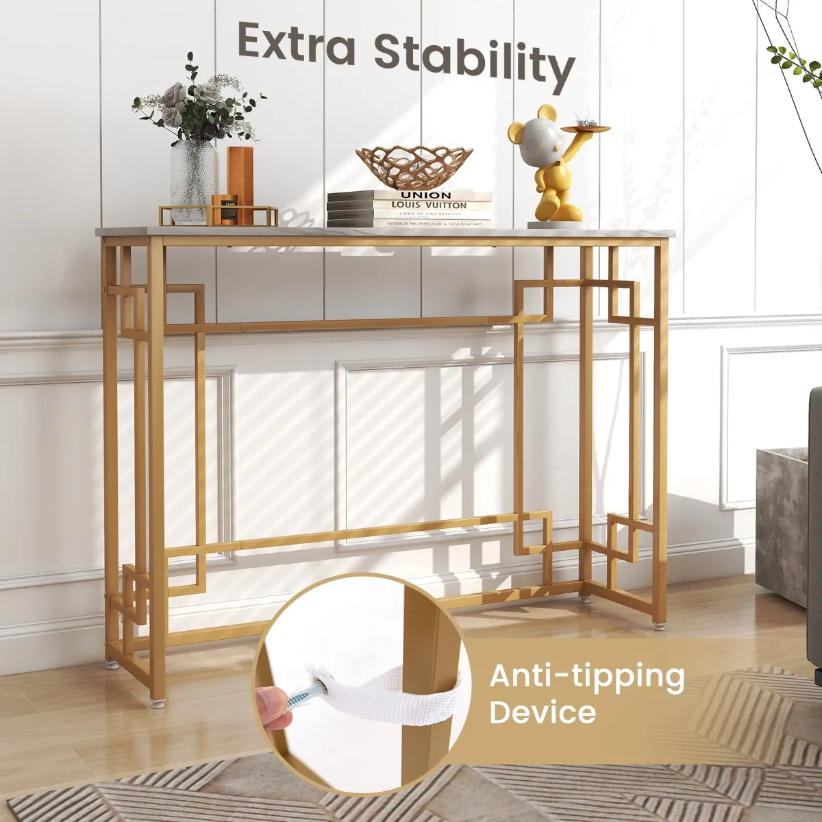 Onze moderne consoletafel, met een blad van imitatie wit marmer, straalt glamour en verfijning uit. Het vergulde frame heeft een prachtig geometrisch patroon, met een chique afwerking die het een perfect middelpunt maakt voor elke kamer. Hij is robuust en duurzaam, dankzij de verstelbare voetsteunen. Een kantelbeveiliging beschermt je dierbaren. Het kan een mooi element zijn in een hal, een prachtig pronkstuk in de gang of een console in de woonkamer, waardoor het perfect is voor elke ruimte.