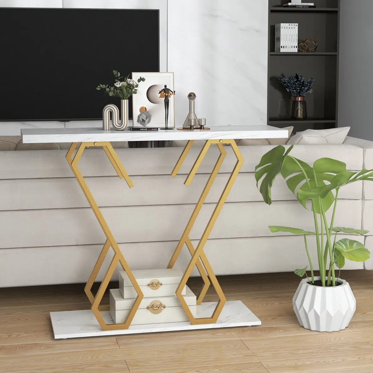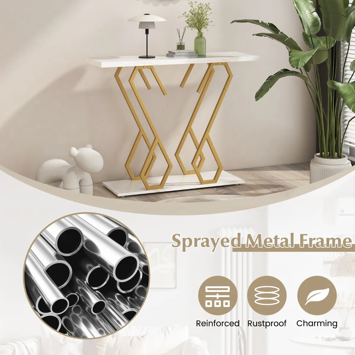 【Nagemaakt marmeren tafelblad】 Om op te vallen heeft de consoletafel een nagemaakt marmeren tafelblad dat er delicater uitziet en een elegante touch benadrukt. Met zijn afmetingen van 100 x 30 cm (L x B) biedt hij genoeg ruimte om hapjes op te leggen, tijdschriften op te sommen of decoraties op te hangen.