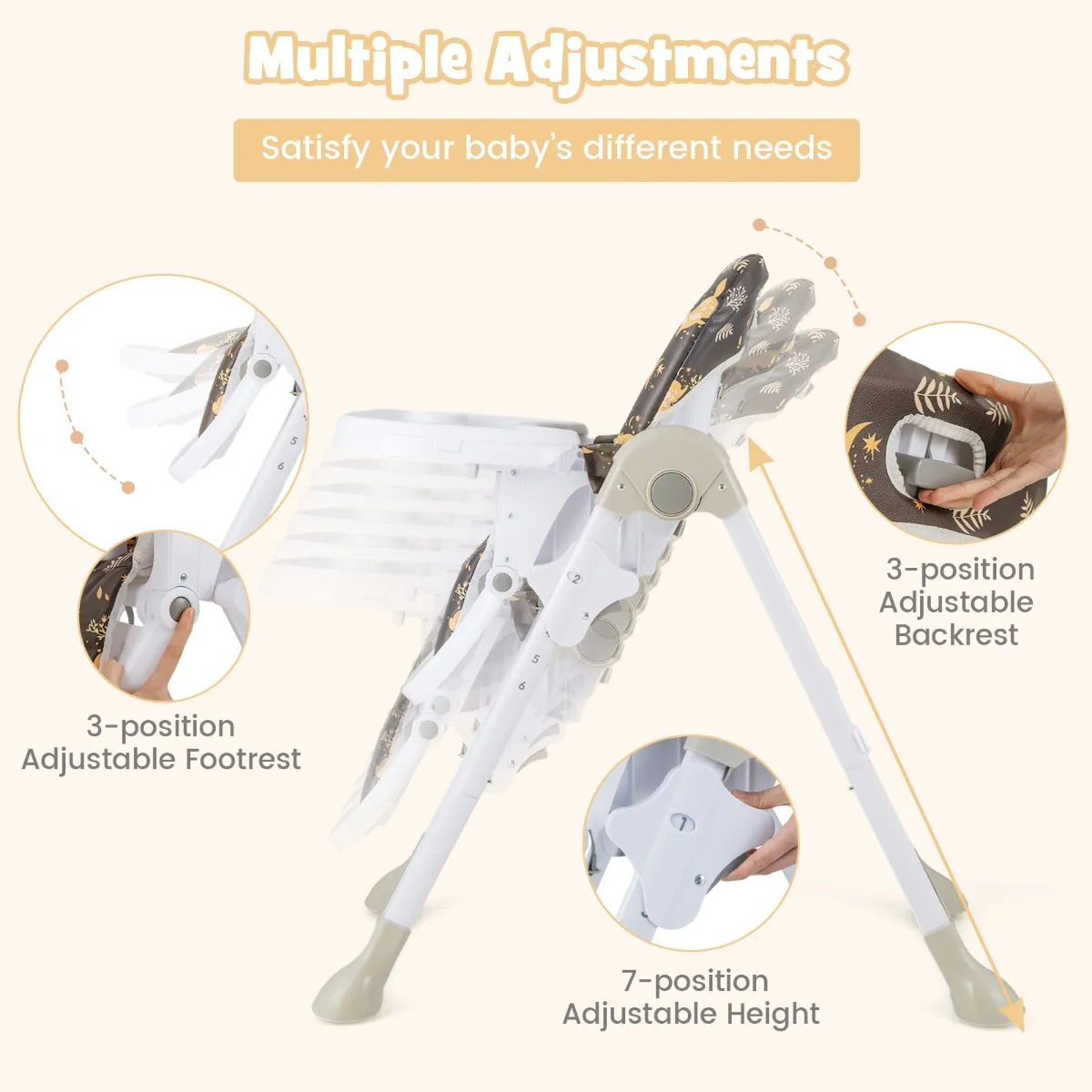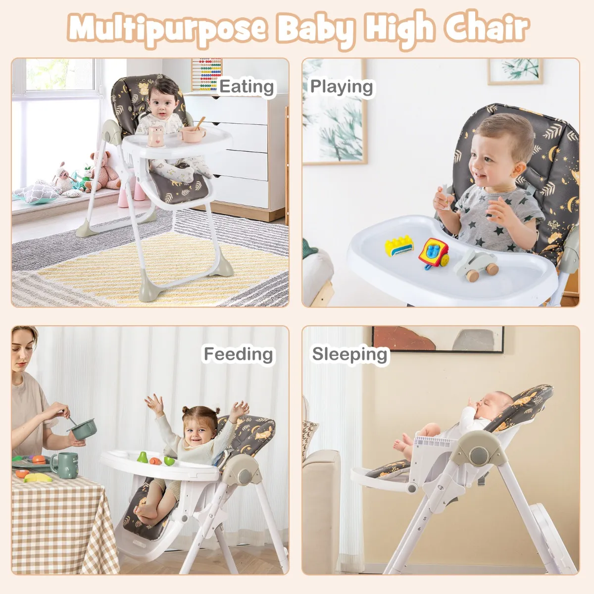 Uitneembaar dienblad in 3 posities: Omdat het serveerbord op de achterpoot kan worden verwijderd, kunt u uw kinderen tijdens het eten dichter bij u houden. Dit vriendelijke en veilige bord beschikt over drie verstelbare horizontale posities om kinderen een perfecte en comfortabele zit- en eetafstand te bieden.