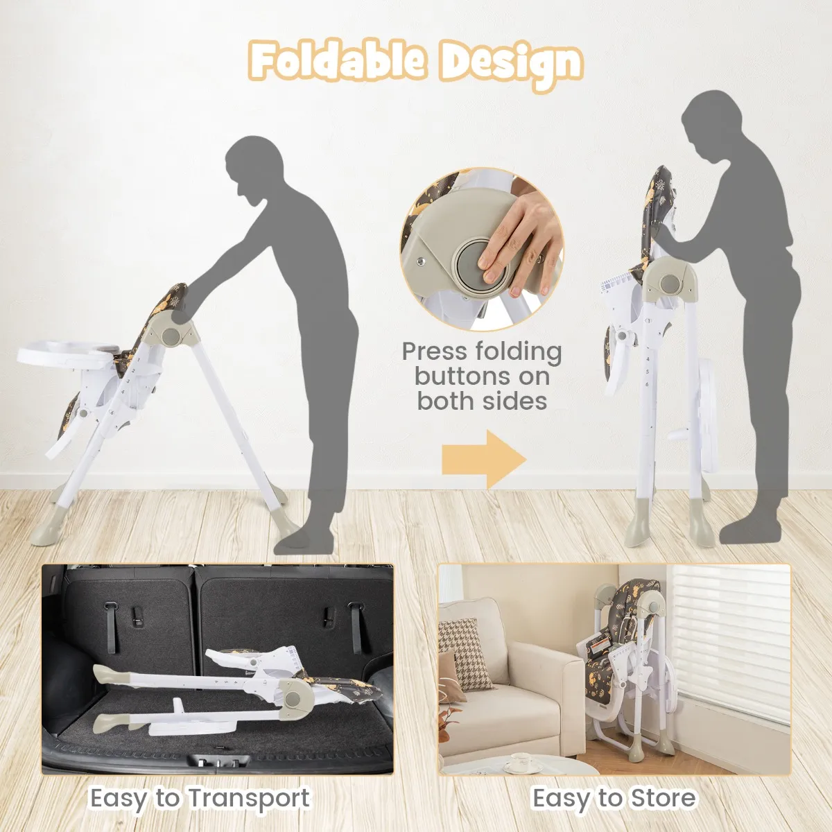 Mobiliteit en draagbaarheid:Â Dankzij de soepel lopende wielen aan de voorpoten verplaats je deze kinderstoel moeiteloos naar elke locatie. Met een brede knop aan beide zijden van de kinderstoel kun je hem snel en gemakkelijk opvouwen tot een compact formaat in je auto, vrachtwagen of in de hoek van je kamer, waardoor je veel ruimte bespaart.