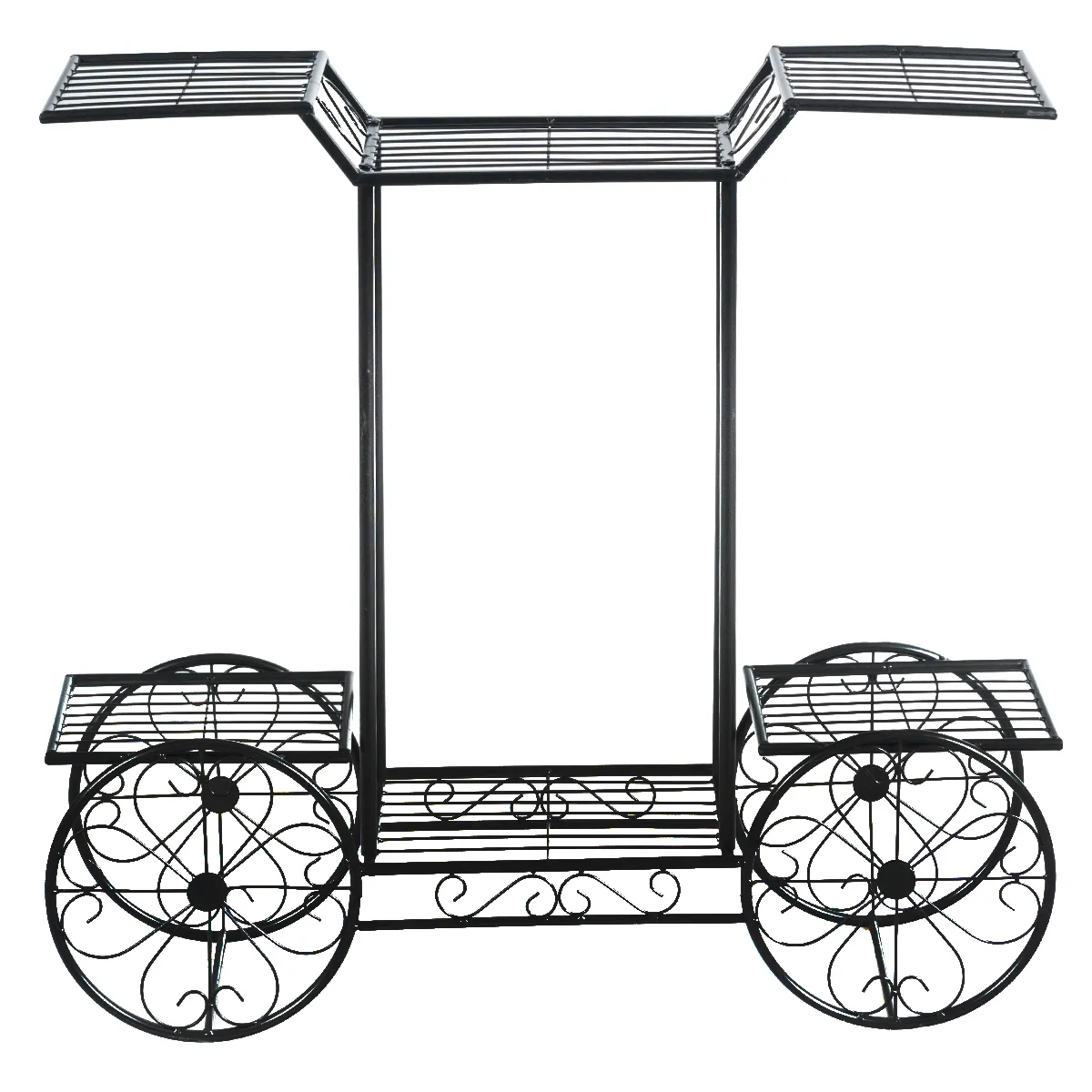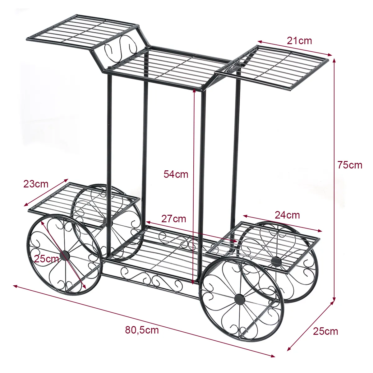 Gemaakt van een volledig metalen structuur met een power-coated oppervlak, is de metalen standaard duurzaam en robuust genoeg voor een lange levensduur. De vorm van de Parijse kar met decor wielen is niet alleen stabiel, maar ook opvallend. Met zijn 6 verdiepingen tellende verticale opbergvorm biedt hij voldoende ruimte voor veel verschillende maten planten. Het holle ontwerp verhoogt niet alleen het ademend vermogen van de planten, maar laat ook overtollig water naar beneden stromen. En de metalen standaard is niet alleen een bloemenplank, maar kan ook worden gebruikt als opbergplaats voor verschillende artikelen. Bovendien is de metalen karrenplankenstandaard zeker een uniek en praktisch accessoire om de ruimte te verlichten! Als u op zoek bent naar een dergelijk product, aarzel dan niet om het nu te kopen!
