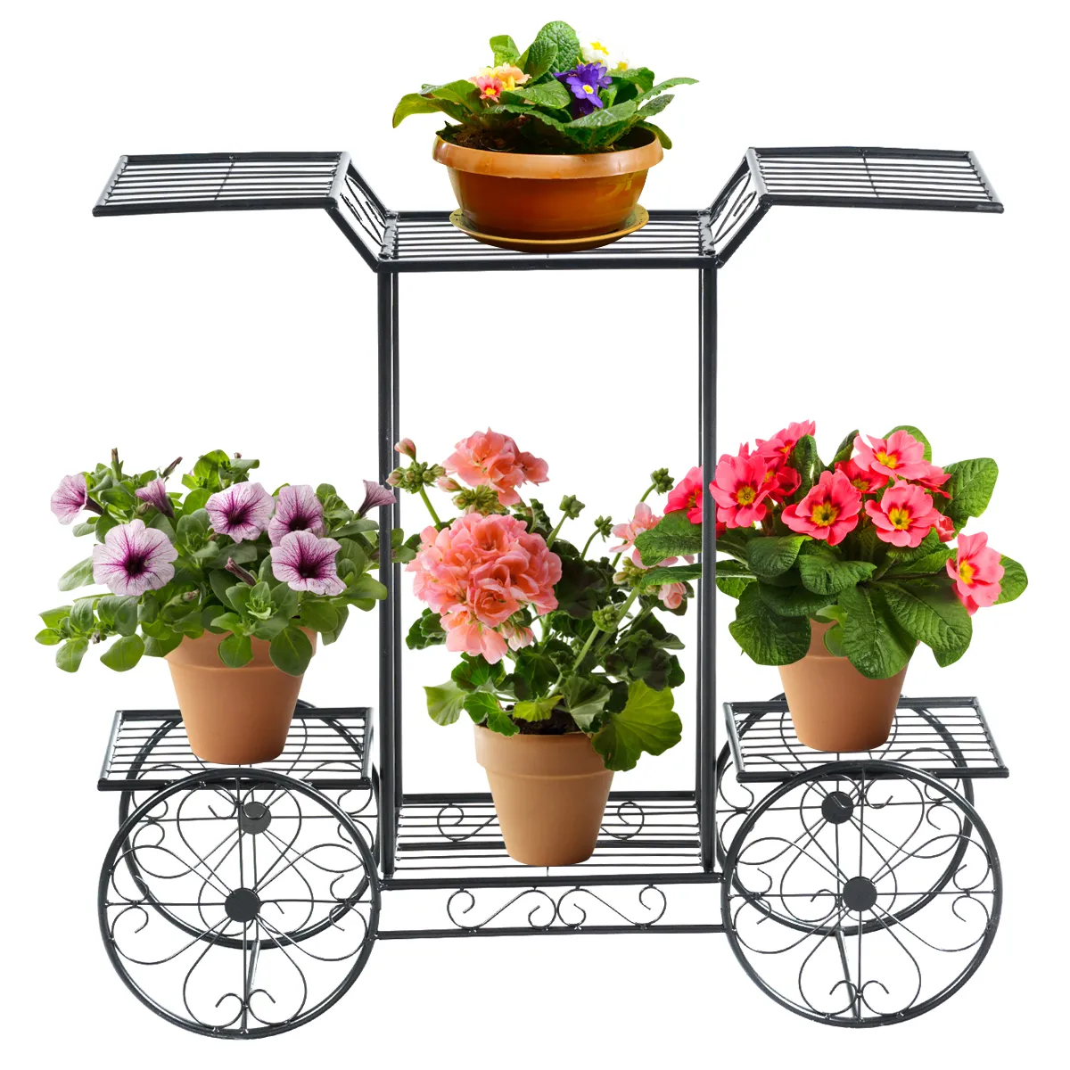 【6 lagen bloempot rek】Wordt geleverd met 6 lagen in totaal, de tuin kar standaard biedt grote ruimte voor het weergeven van planten, bloemen, en tuin decoraties. De verspringende verticale plank garandeert een betere groei van elke pot met bloemen. Bovendien is het compacte formaat een combinatie van verticaal ontwerp, het metalen rek is plaatsbesparend.