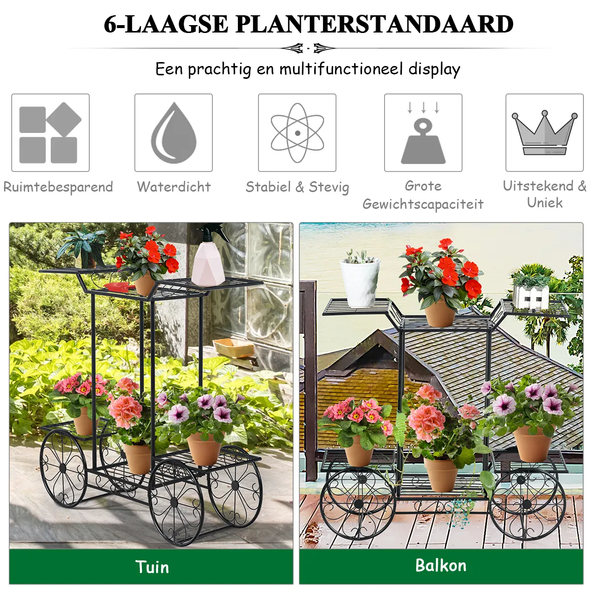 【Metalen constructie met robuuste planken】Gemaakt van volledig metaal, is de plantenstandaard duurzaam en stevig voor zorgeloos gebruik. Met een zwart gepoedercoat oppervlak zal de plantenstandaard niet snel roesten en het goed doen in de buitenlucht. Bovendien zorgen vier decoratieve wielen en 2 extra stokken voor extra stabiliteit van de plantenstandaard voor een veelzijdig gebruik.