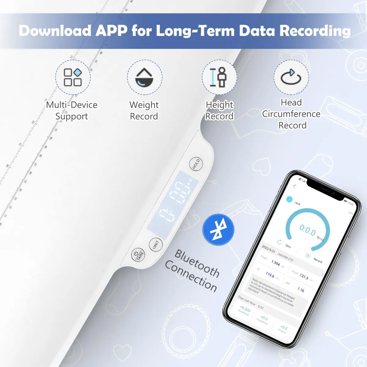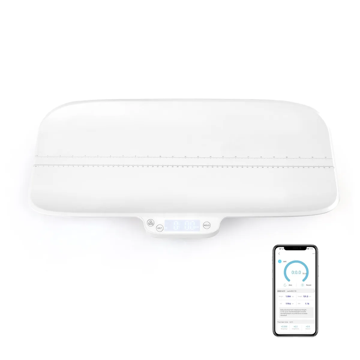 Onze digitale weegschaal kan het gewicht (tot 30 kg) en de lengte (tot 60 cm) meten en kan gebruikt worden voor baby’s of huisdieren. De weegschaal is ontworpen met 4 weegeenheden: lbs/g/kg/oz, en de nauwkeurigheid is 2g, voor nauwkeurige metingen. Hij heeft een functie om het weergegeven gewicht te behouden, zelfs als je baby beweegt. Hij heeft een tarrafunctie, zodat je hem op nul kunt zetten. Hij kan worden aangesloten op de Baby Fit app, die weeggegevens registreert om de groei van je baby te volgen.