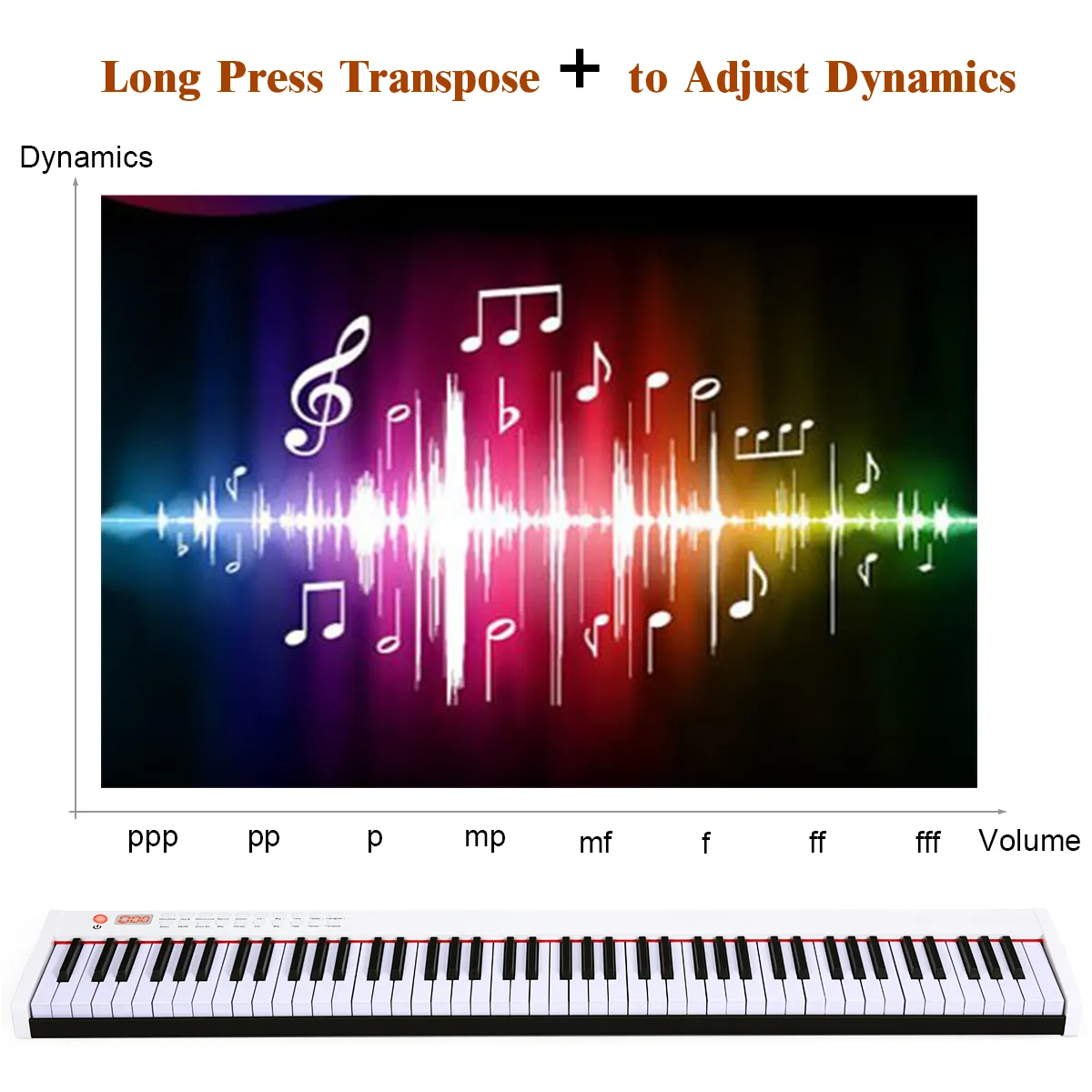 【88 volledig grote toetsen voor een echt pianogevoel】Het digitale pianoklavier is ontworpen met 88 volledig grote en gewicht gevoelige toetsen (1:1 pianotoet verhouding), die u een comfortabele vingeraanraking en een nauwkeurig geluid kunnen geven. Bovendien kunt u de transponeer+ toets lang indrukken om de aanslag reactie aan te passen aan de speelstijl van uw voorkeur.