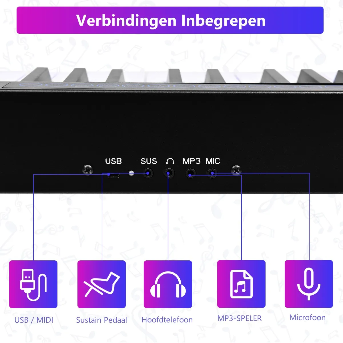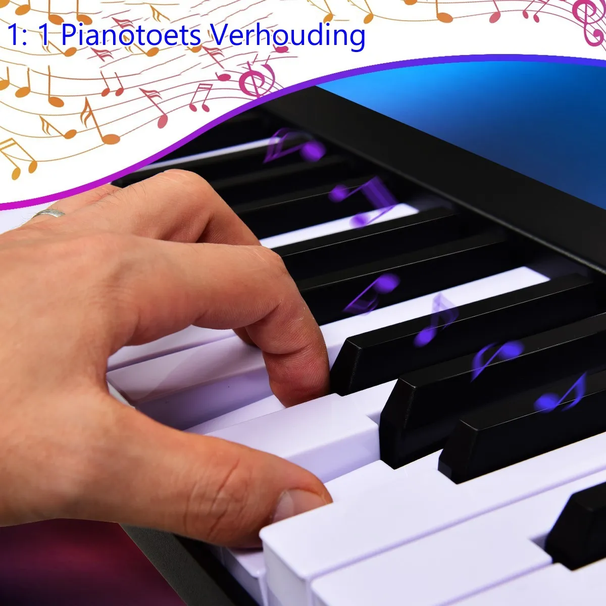 Grote en gewogen toetsen voor soepel en veilig spelen: De grote en zware toetsen, 1:1 pianotoetsverhouding, bieden een comfortabele druk en zorgen voor een gelijkmatige diepte. Gemaakt van duurzaam ABS-materiaal, voorkomen de toetsen dat ze per ongeluk wegglijden tijdens het spelen en de resulterende vervaging van de klank om een langdurig en schoon geluid te behouden.