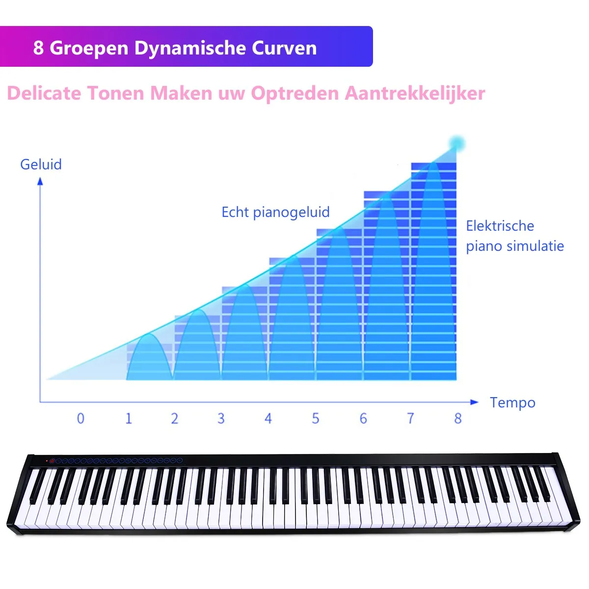 Ons verbeterde digitale toetsenbord met 88 toetsen en een draagbare draagtas is het ideale muziekinstrument voor zowel beginners als gevorderden. De grootste innovatie hier is de dynamische aanpassing, mogelijk gemaakt door lang op de Transpose+-knop te drukken. Daarnaast zorgt de siliconen plaat voor een hogere veerkracht dan een conventionele PVC plaat om storingen te voorkomen. Evenzo biedt het externe geluid een luider en beter geluid dan het interne, wat de akoestiek enorm verbetert. De leerfunctie helpt de gebruiker om demo’s gemakkelijk te leren en de Bluetooth-functie is handig voor elke gebruiker om het spel te volgen via mobiele telefoons. Extra functies zoals beveiligingsfunctie, MIC-functie, MP3-functie, opnamefunctie, drums en akkoorden zorgen voor een betere en meer op maat gemaakte speelervaring.
