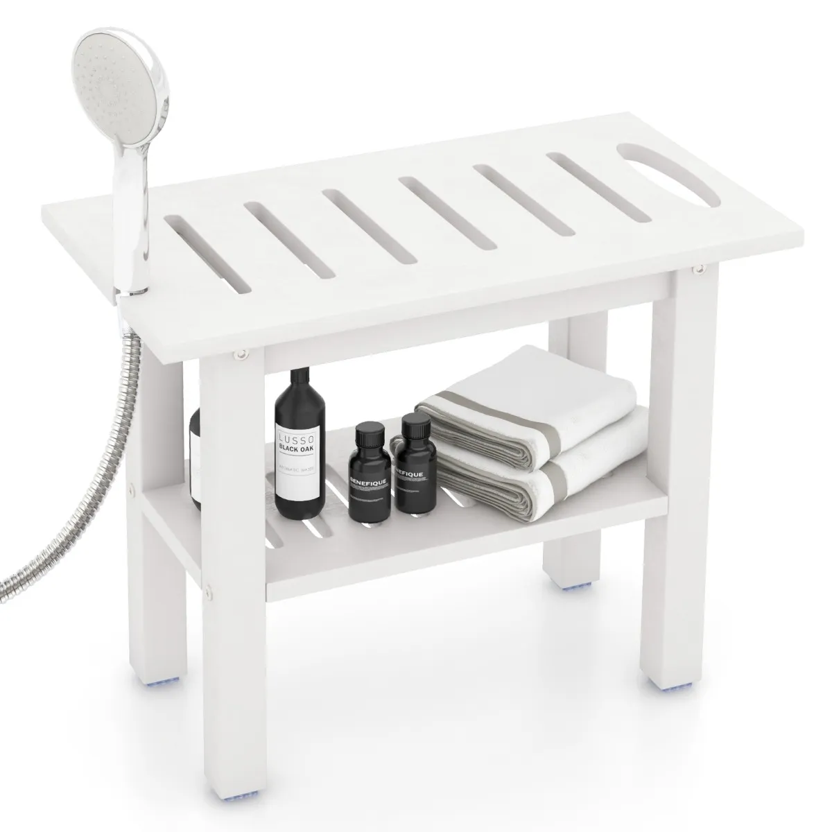 【Grote opbergruimte】: Dankzij het ontwerp met twee niveaus en de handige douchekophouder is de badkruk ideaal om al uw douchebenodigdheden binnen handbereik op te bergen. Bovendien is de onderste plank op een slimme manier 20 cm verhoogd, zodat er geen spullen op de natte douchevloer terechtkomen.