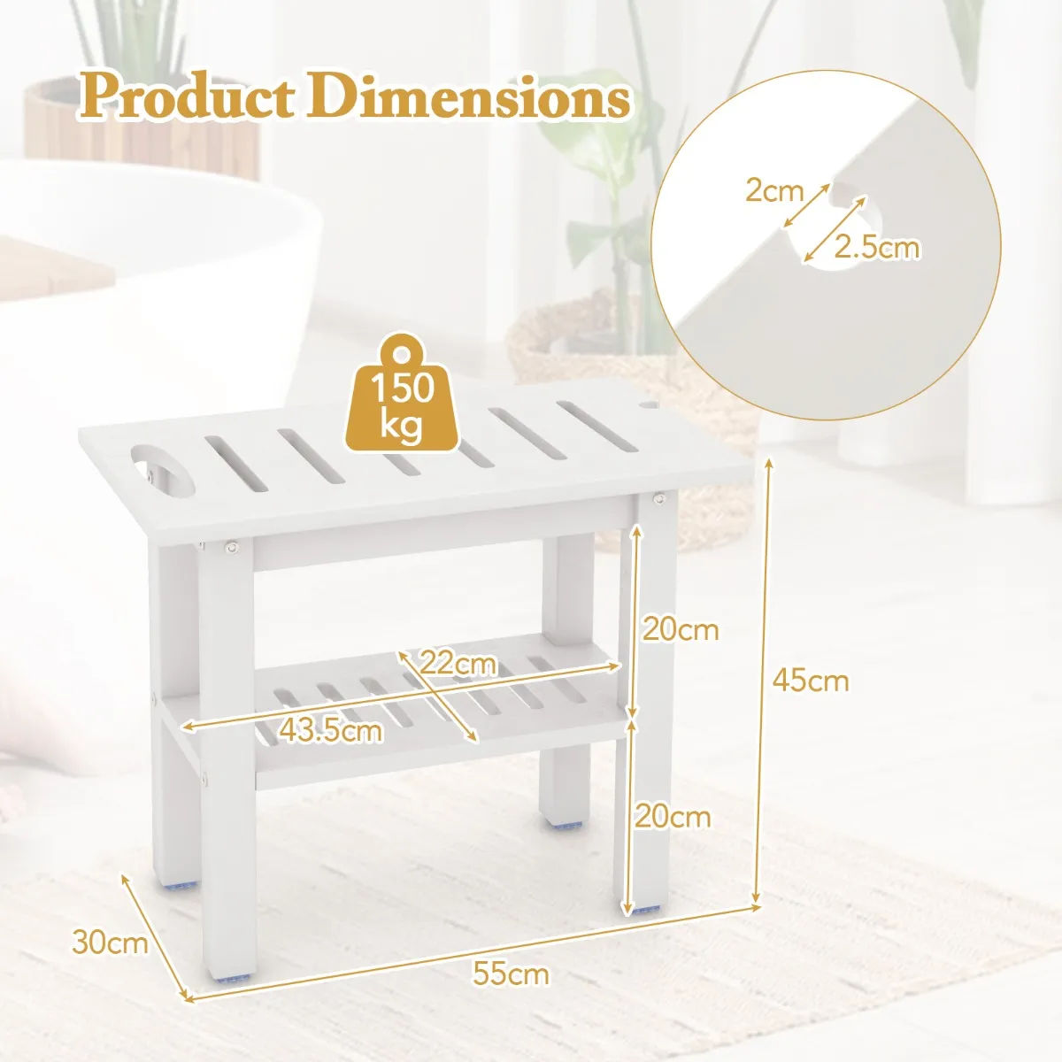 【Gebruiksvriendelijke details】: De badkamerkruk is ontworpen voor uw comfort en heeft een ergonomische hoogte van 45 cm. De licht gebogen zitting vermindert de belasting van uw lichaam. Dankzij de uitgesneden handgreep is de tas gemakkelijk te dragen en kunt u hem ook gebruiken als handige handdoekhouder.
