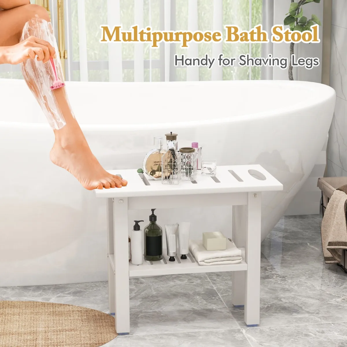 【Veelzijdige badkruk】: Voor mensen met mobiliteitsproblemen biedt een douchebank een gemakkelijkere en meer ontspannen badervaring. Het is ook perfect voor persoonlijke verzorgingsroutines, zoals het aanbrengen van bodylotion of het scheren van de benen, of zelfs als handige opbergtafel voor vochtige buitenomgevingen.