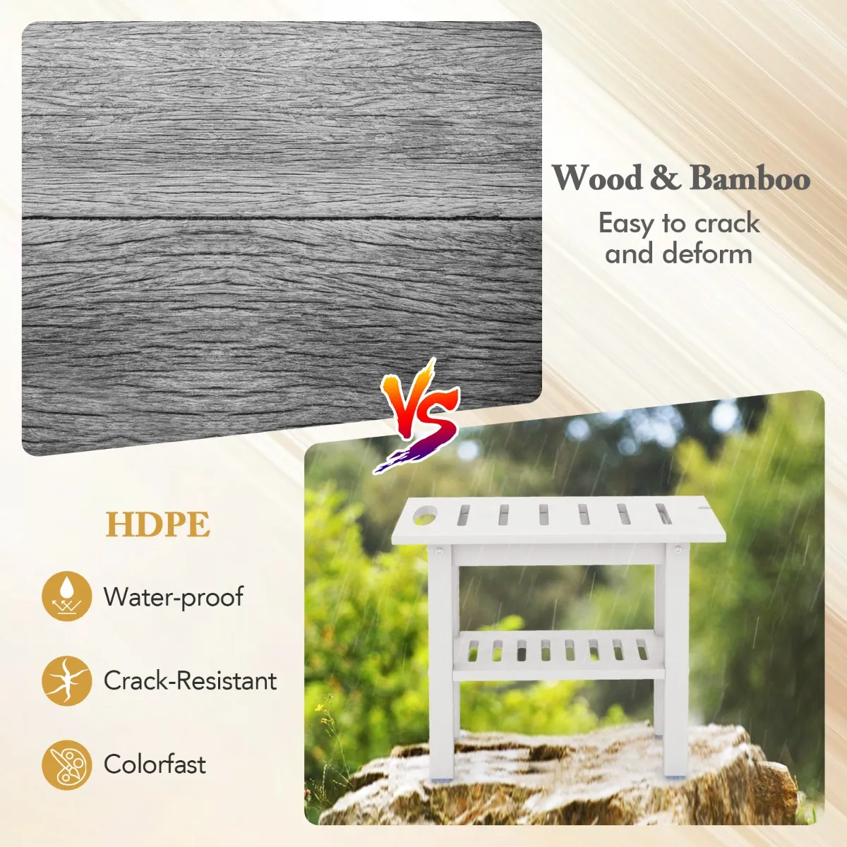 【Hoogwaardig HDPE-materiaal】: In tegenstelling tot douchekrukken van hout of bamboe, die gevoelig zijn voor scheuren en kromtrekken, is deze HDPE-douchebank waterdicht en slijtvast en geschikt voor gebruik in badkuipen of douches.