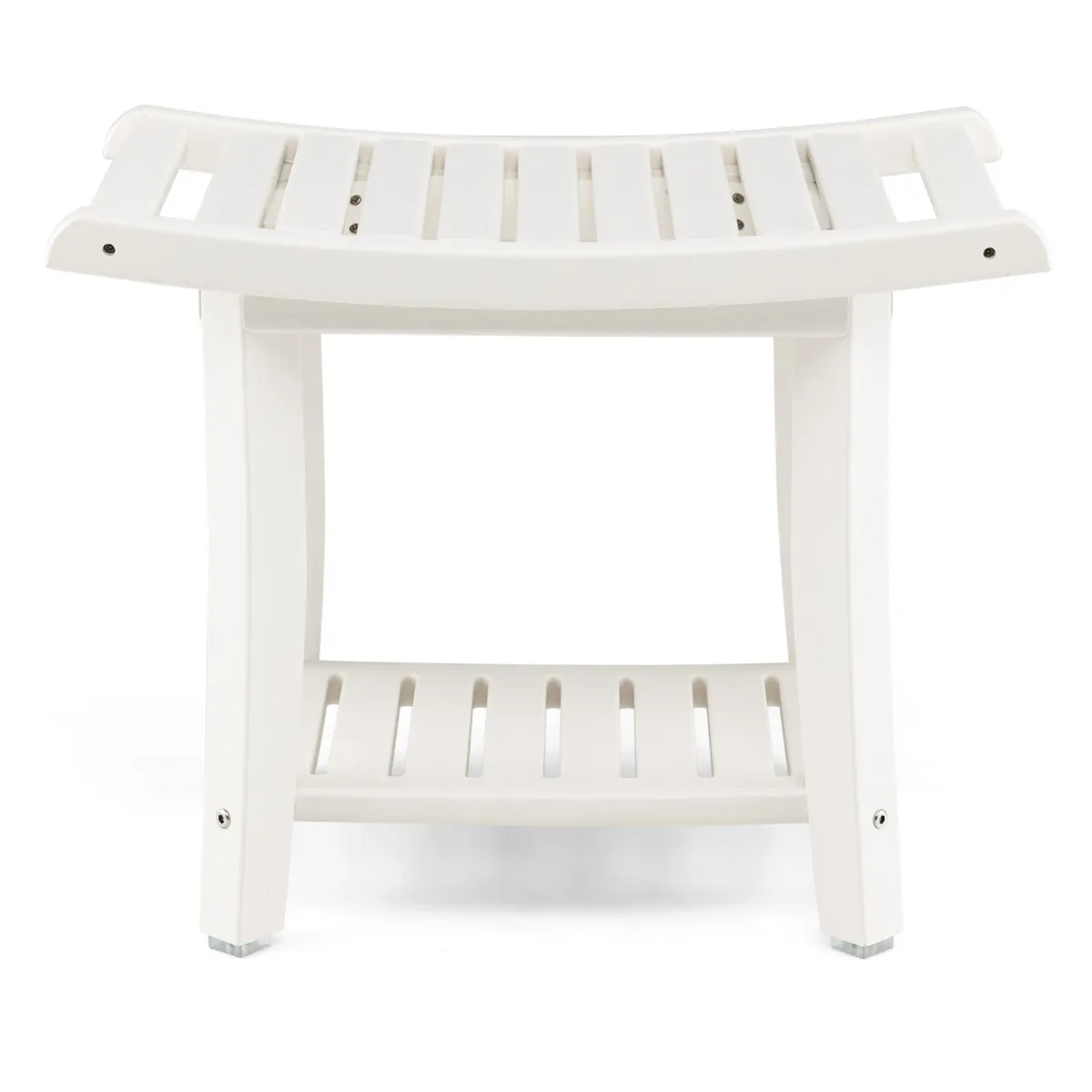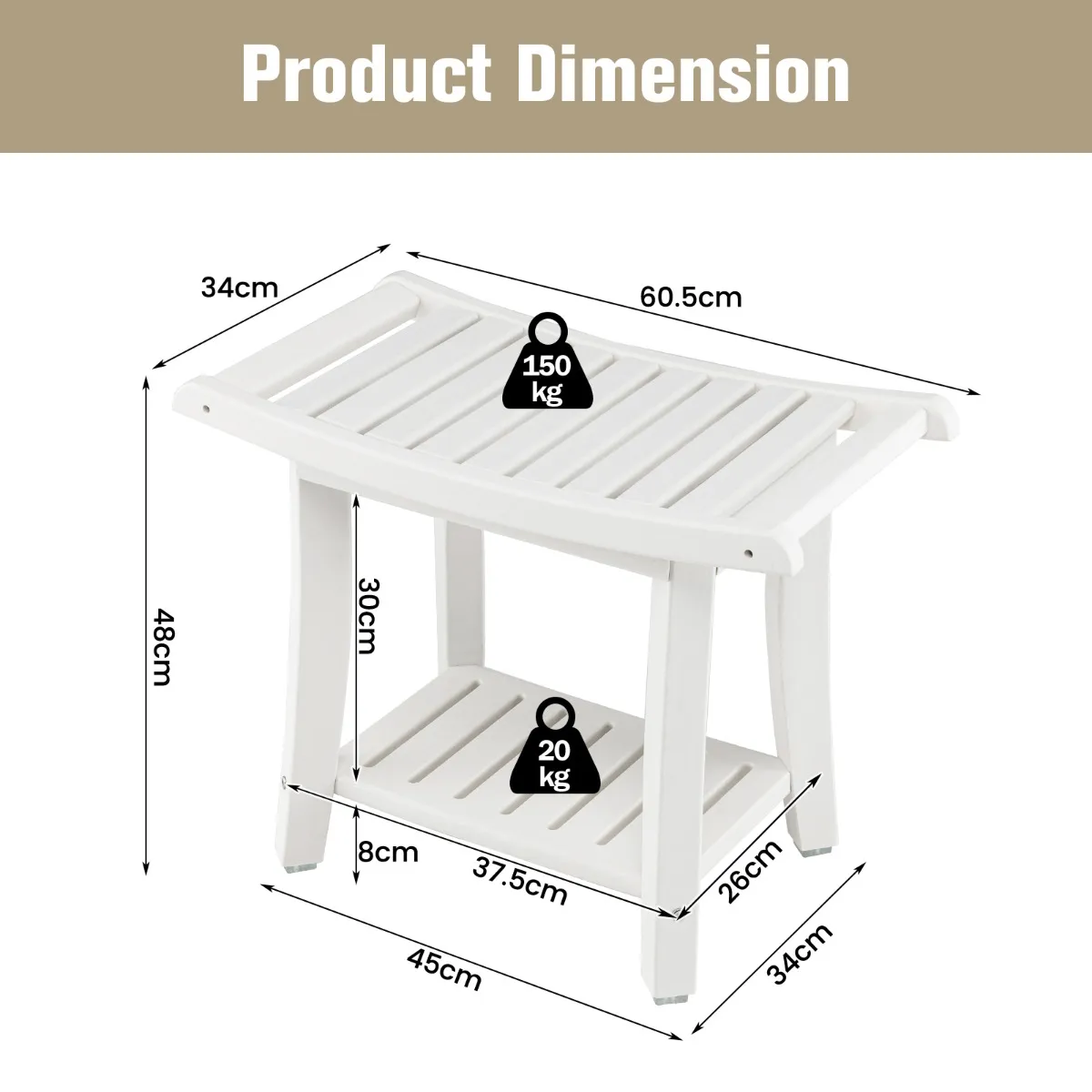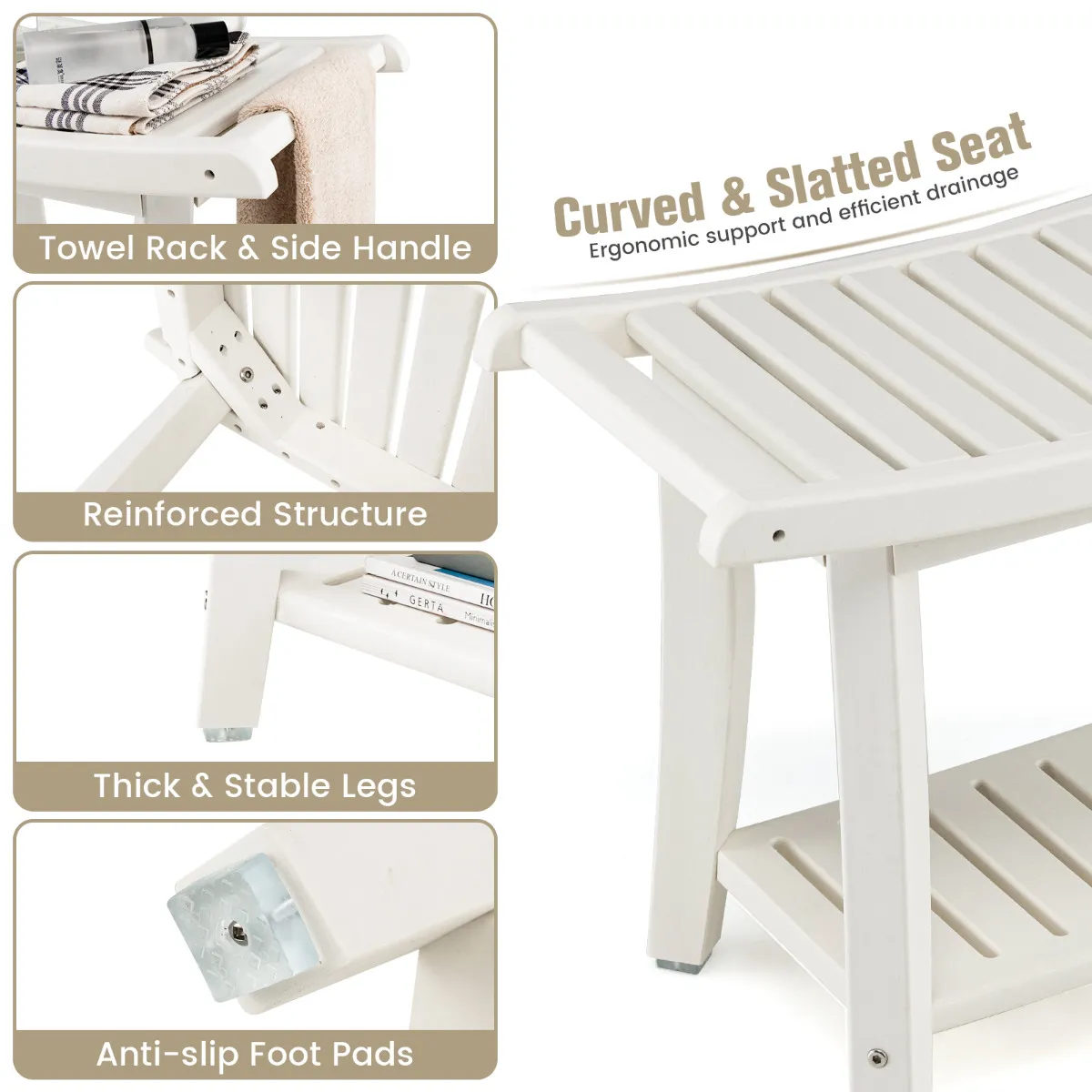 Gemaakt van hoogwaardig HDPE-materiaal met stevige verbindingen, biedt deze douchekruk een goede weerstand tegen vocht en schimmel; hij zal niet gemakkelijk kromtrekken, dus hij zal u zeer lang meegaan. De gebogen poten maken de douchebank stabieler, en de antislipviltjes op de bodem voorkomen dat hij wegglijdt voor extra veiligheid. Bovendien maakt de gebogen zitting met afgeronde hoeken en veegvrije randen ons bankje nog veiliger in gebruik. Het biedt voldoende ruimte voor het opbergen van toiletartikelen of andere zaken. Het is perfect voor gebruik bij het zwembad, in de sauna, het bubbelbad of in de douche, in de entree, slaapkamer, woonkamer, enz.