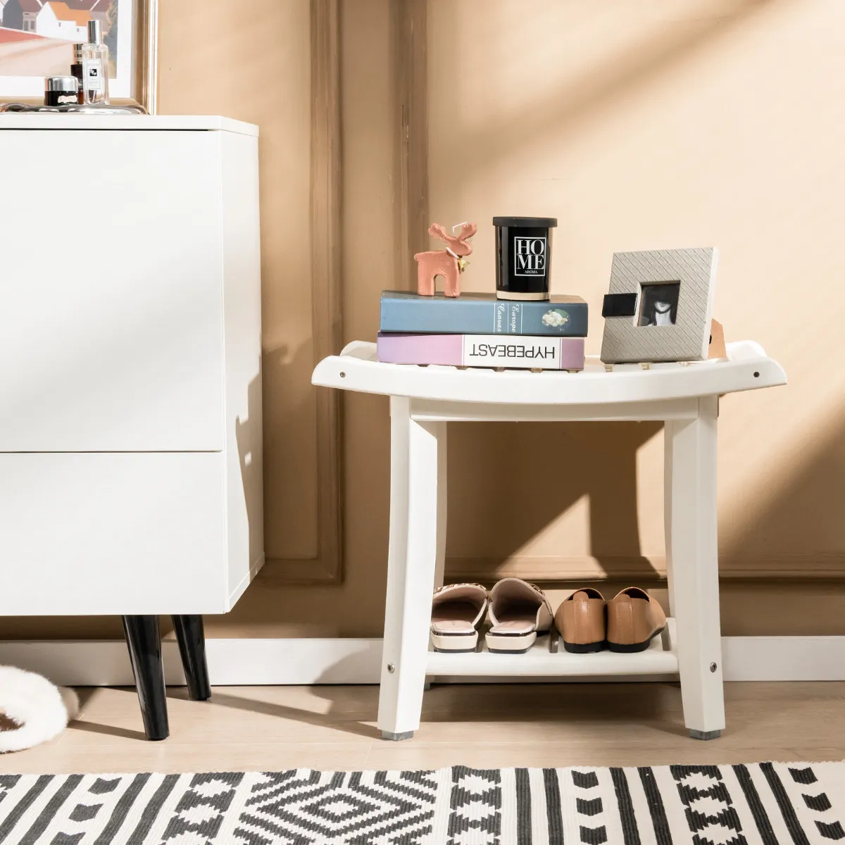 Breed scala aan toepassingen: Naast het gebruik als douchebankje in de badkamer kan het ook dienen als klein schoenenrek bij de ingang, kaptafelkrukje in de slaapkamer en koffietafel in de woonkamer. De moderne, eenvoudige stijl en het multifunctionele ontwerp maken dit product een perfecte aanvulling op uw huis.