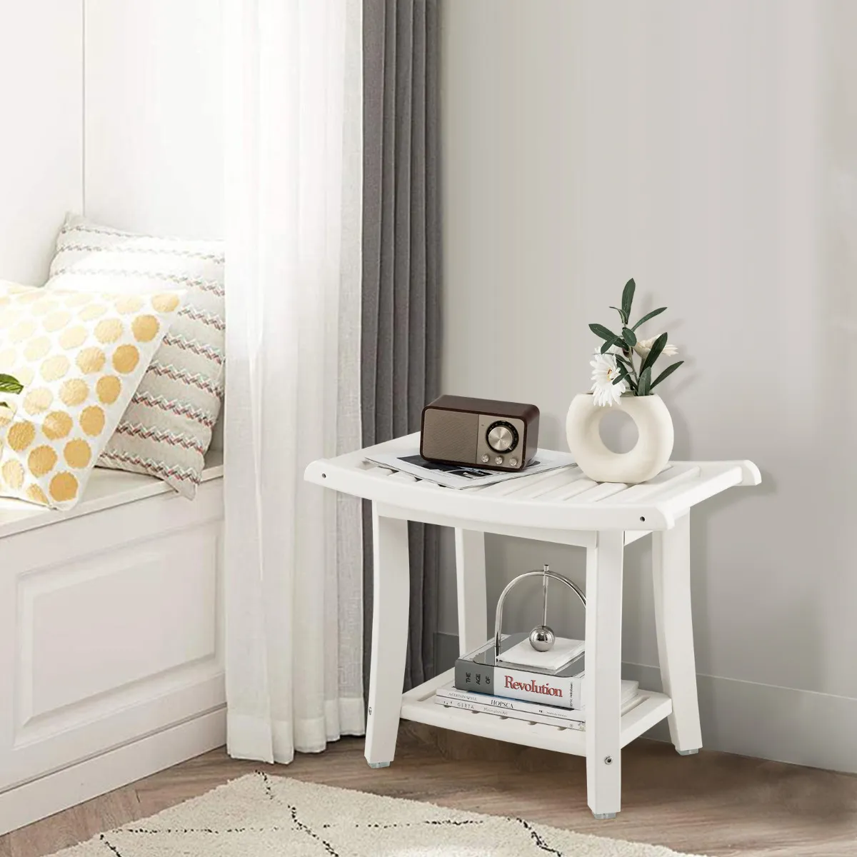 Opbergruimte op 2 lagen:Â Deze douchebank met 2 lagen en een open bodemplank biedt voldoende ruimte voor verschillende voorwerpen, zoals badzeep, handdoeken, lichaamsreinigers, kaarsen, decoraties, tijdschriften enzovoort. De handgrepen aan de zijkant kunnen worden gebruikt als handdoekrekken om natte handdoeken op te hangen.
