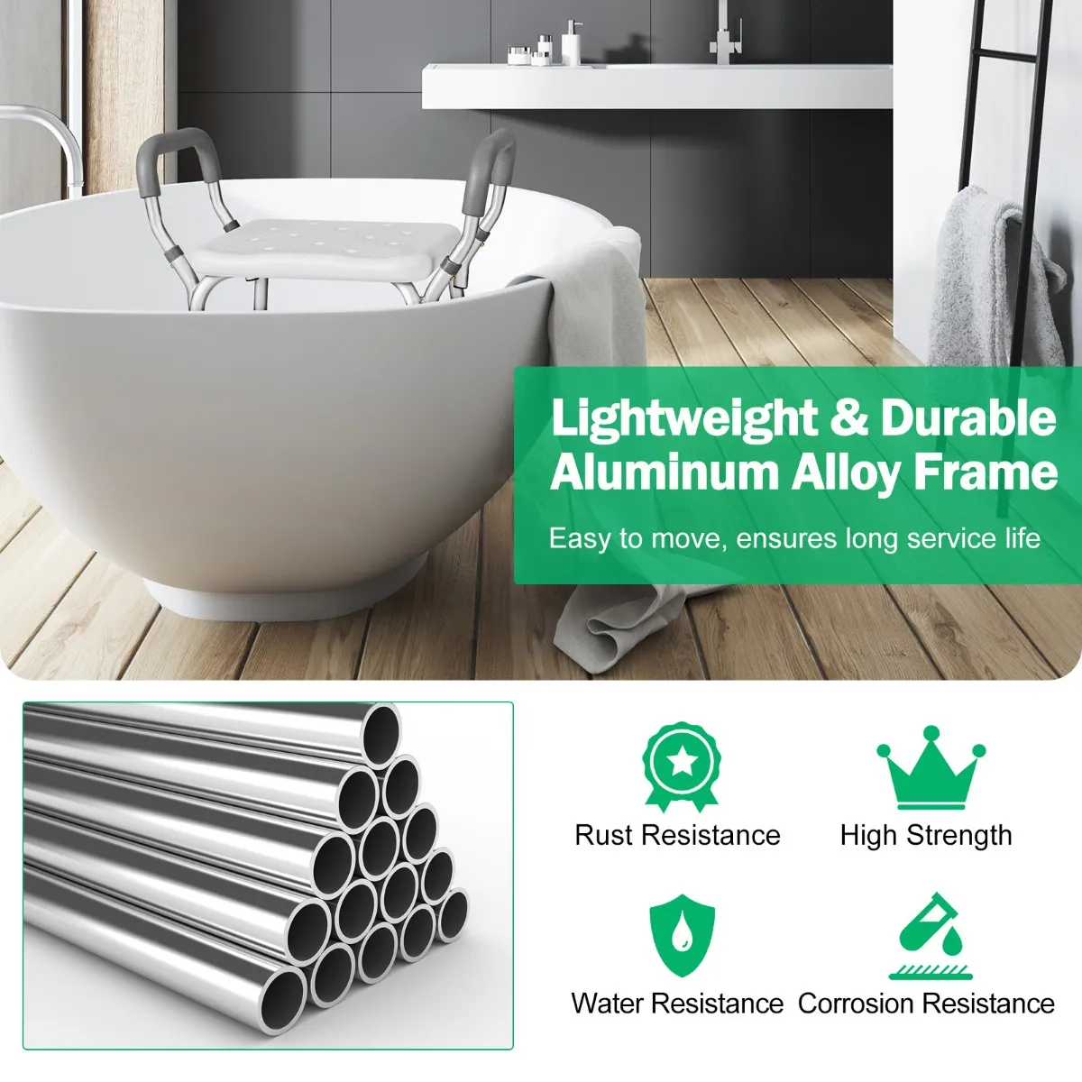 【Uitstekende stevigheid en stabiliteit】De badstoel wordt ondersteund door een frame van geanodiseerde aluminiumlegering met hoge sterkte, dat roestbestendig, vervormingsbestendig en duurzaam is en een groot draagvermogen van 100 kg heeft. Bovendien heeft de stoel 4 grote rubberen matten die voor meer wrijving zorgen en stevig aan de vloer blijven kleven.