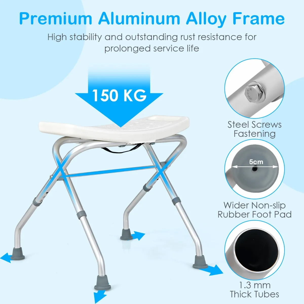 Robuuste constructie: de douchestoel is gebouwd met een frame van aluminiumlegering dat niet alleen corrosiebestendigheid garandeert, maar ook een hoge belastbaarheid tot 150 kg biedt. Bovendien verhogen de rubberen voetjes de wrijving met de vloer en voorkomen ze uitglijden.