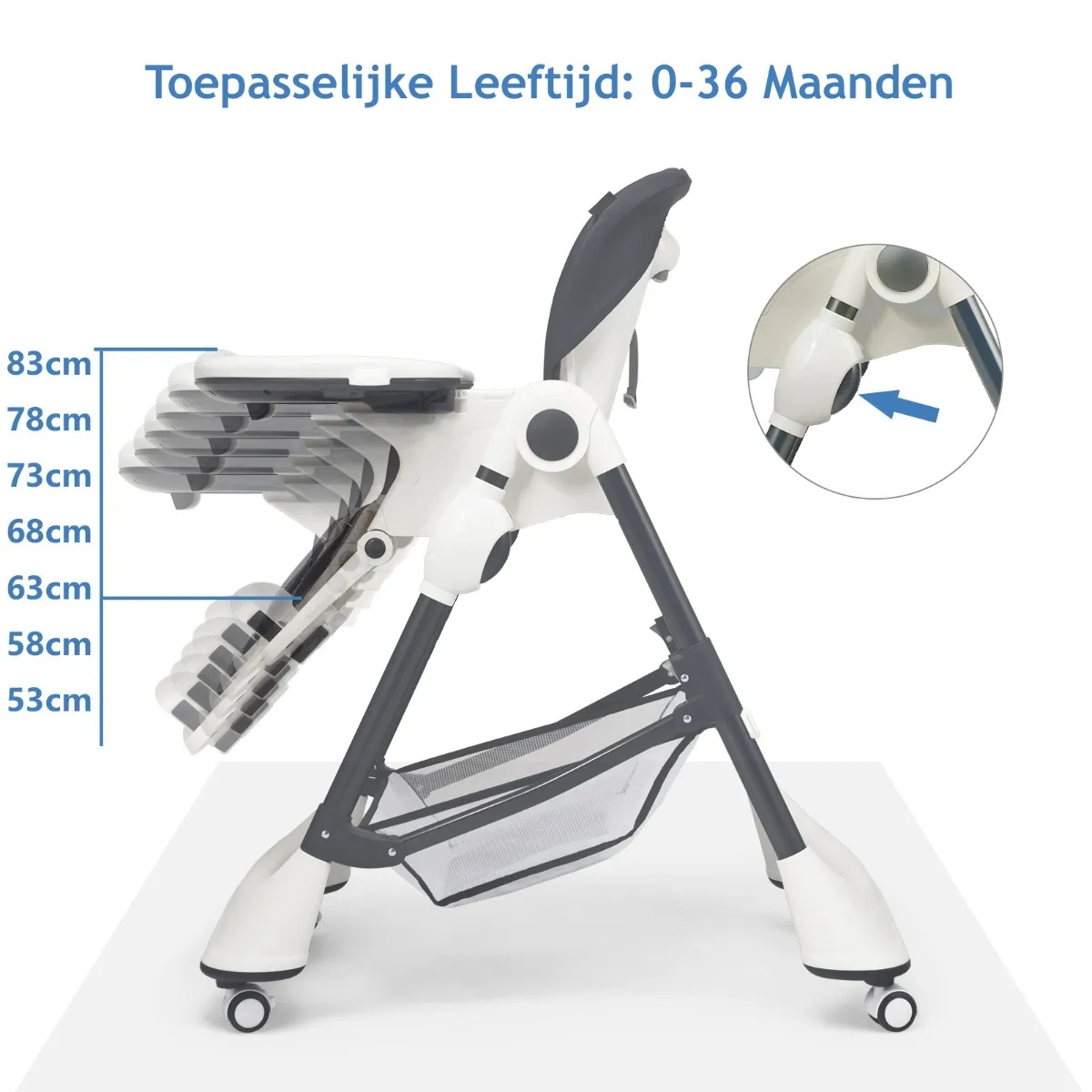 De plateaus kunnen in 3 standen worden versteld om ze aan te passen aan het lichaam van je baby