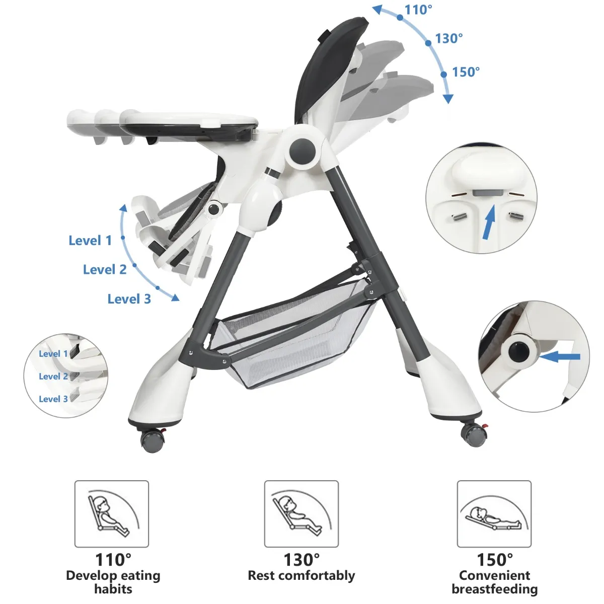 Meerdere comfortabele verstellingen: De rugleuning is ontworpen met 3 verstelbare posities en de voetensteun kan ook in 3 posities worden versteld om aan de verschillende houdingen van je baby te voldoen. Bovendien zijn er 7 verstelbare hoogtes om aan te passen aan de verschillende tafelhoogtes bij jou thuis.