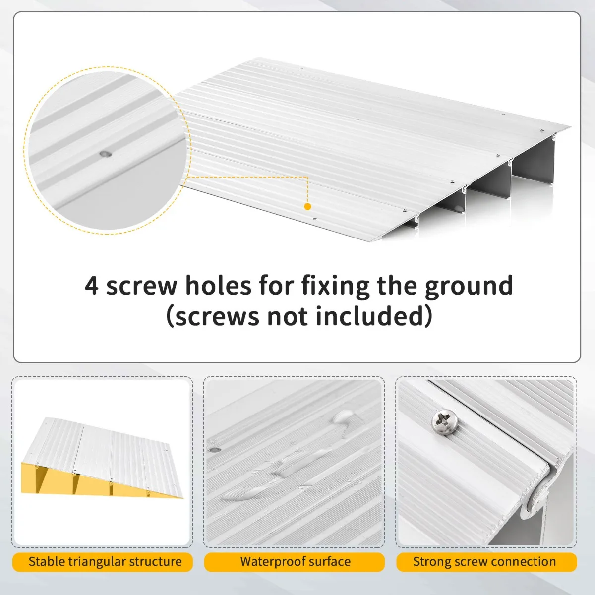 Verstelbare oprijplaathoogte: Dankzij de verstelbare klep kan deze drempeloprijplaat gemakkelijk op de gewenste hoogte (4,5 tot 10,5 cm) worden bevestigd, waardoor een soepele overgang tussen oppervlakken wordt gegarandeerd. Bovendien kunnen de 4 secties van de drempeloprit worden vastgemaakt of losgemaakt om de hoogte aan te passen aan je behoeften.