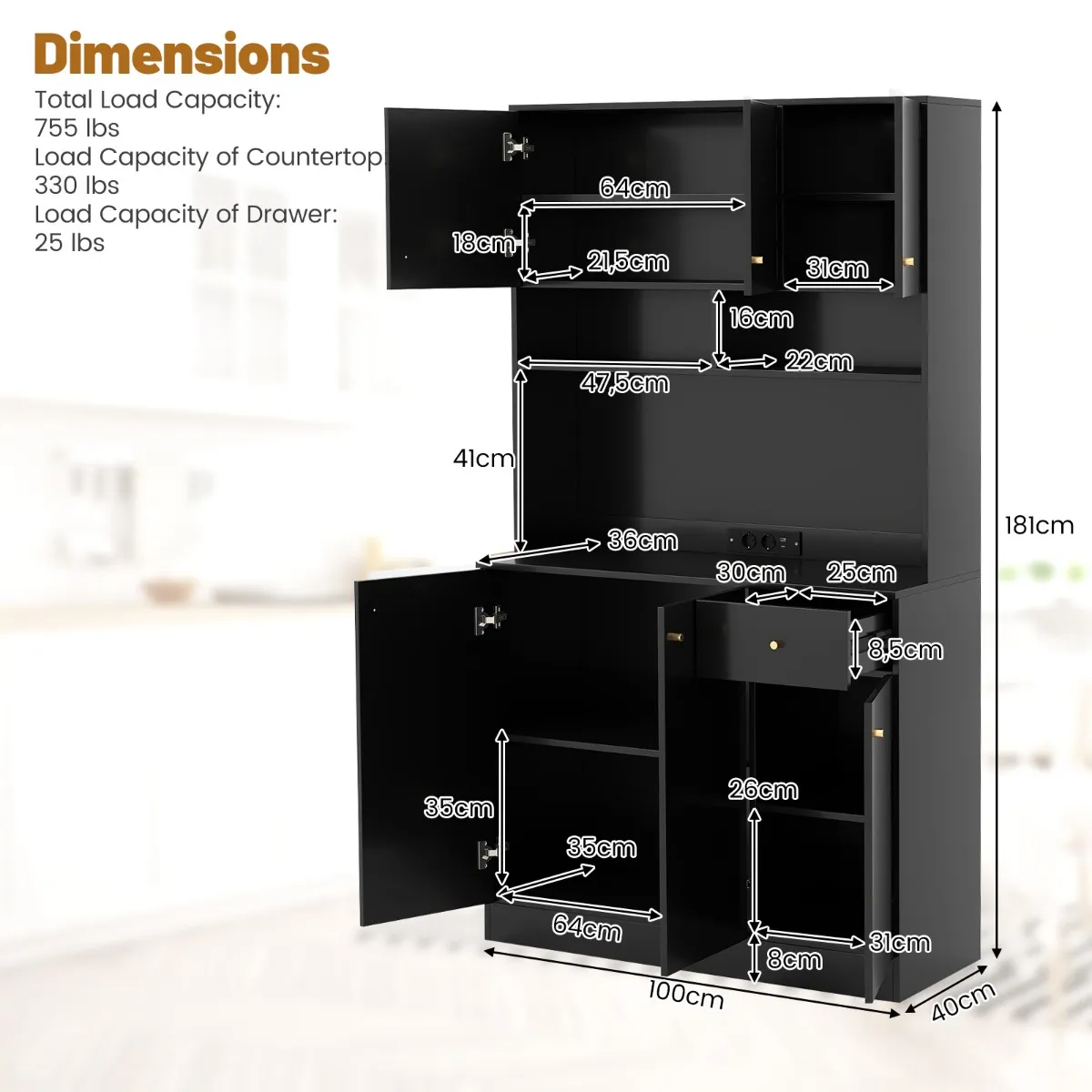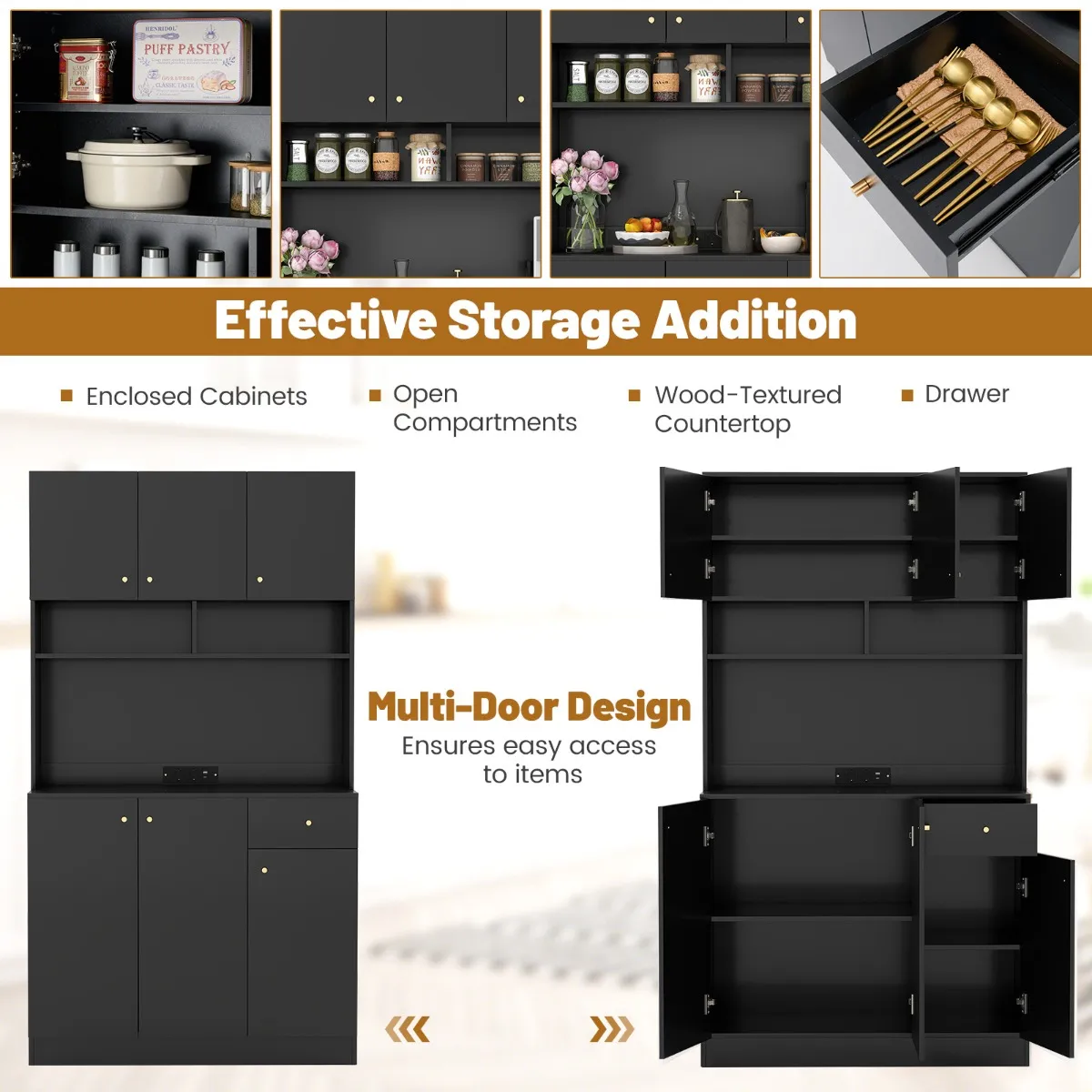 【Ideale elektrische toegankelijkheid 】: Geen tekort aan stopcontacten meer. De 181 cm hoge keukenkast heeft 2 x 125V 12A AC stopcontacten en 2 x 5V Max. 2.1A USB poorten, waardoor het makkelijk is om keukengadgets te gebruiken en apparaten op te laden.