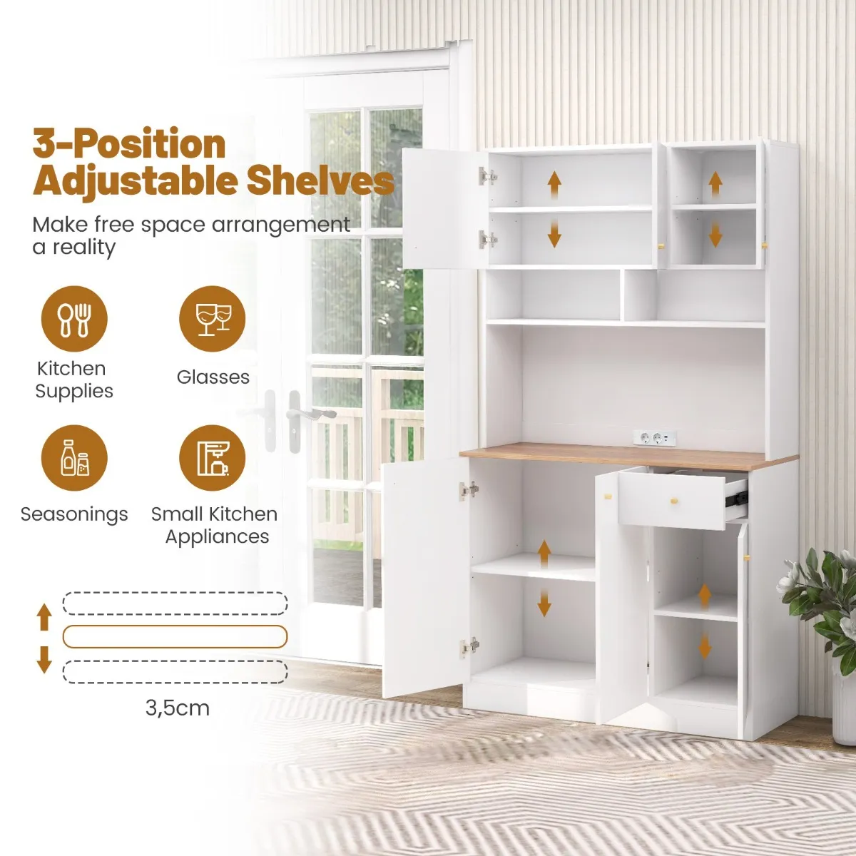 【Ideale elektrische toegankelijkheid 】: Geen tekort aan stopcontacten meer. De 181 cm hoge keukenkast heeft 2 x 125V 12A AC stopcontacten en 2 x 5V Max. 2.1A USB poorten, waardoor het makkelijk is om keukengadgets te gebruiken en apparaten op te laden.