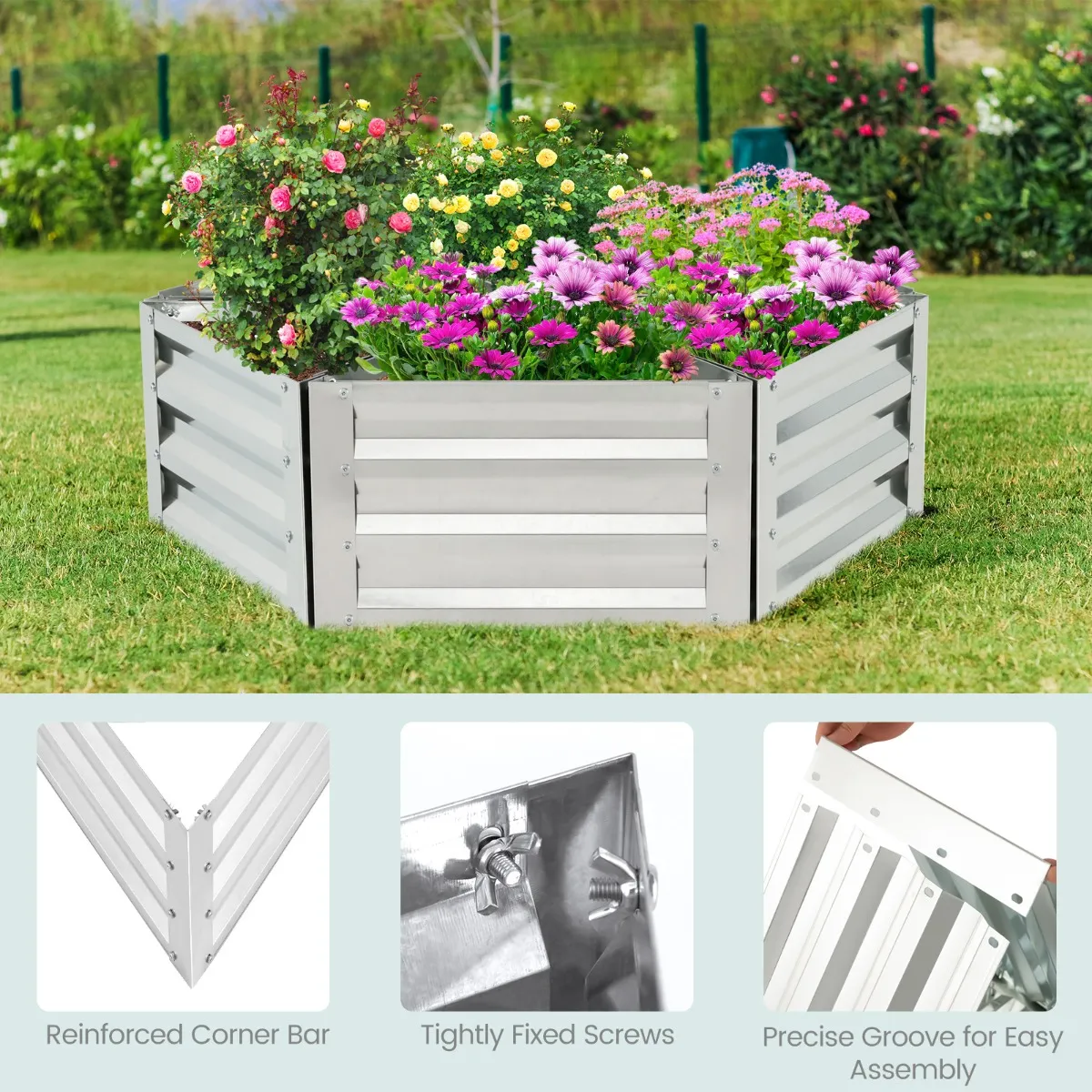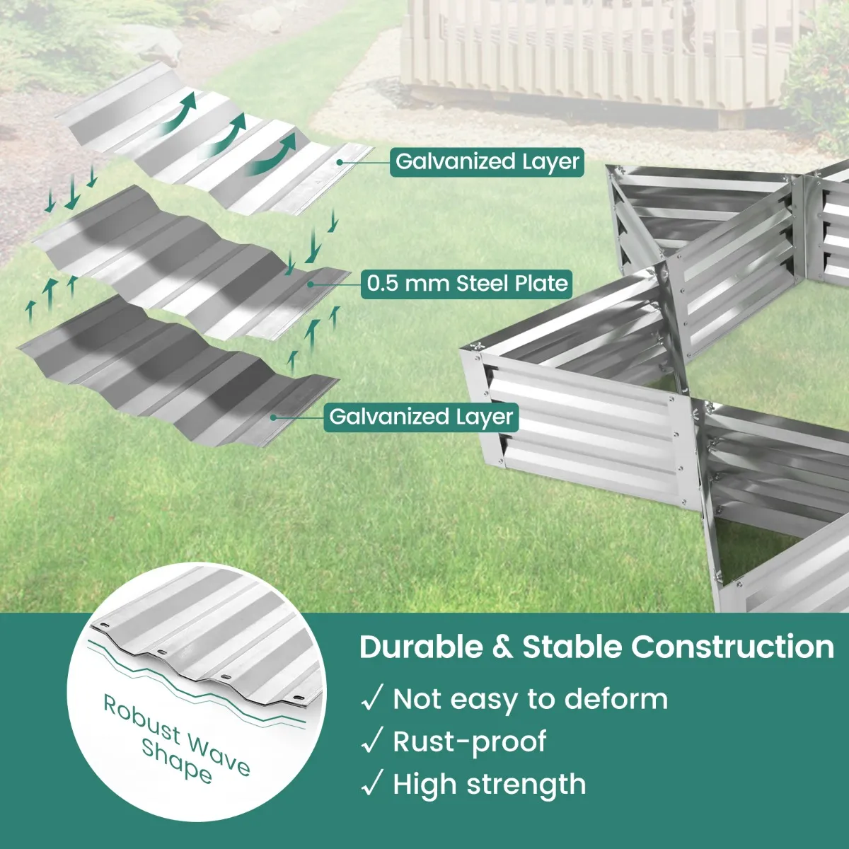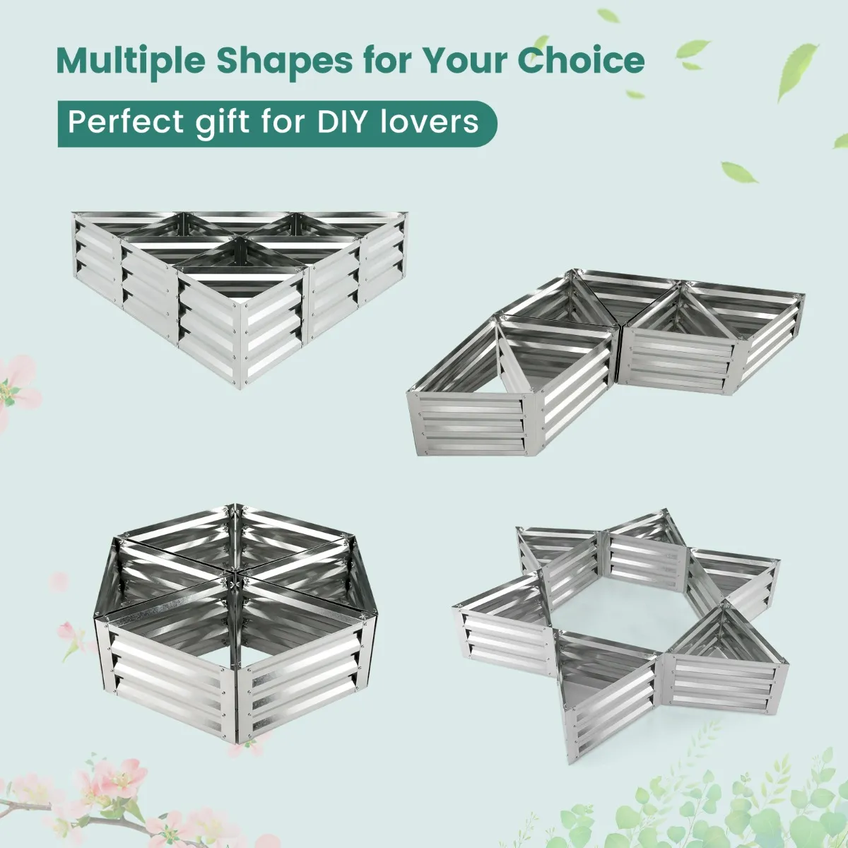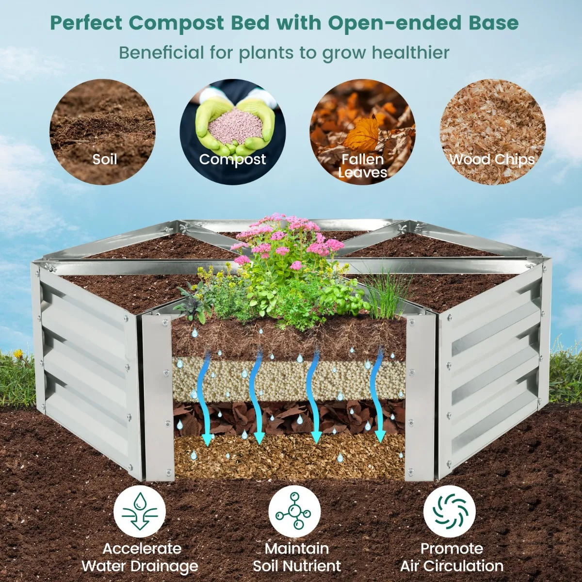 Geleverd met 6 grote driehoekige bakken, biedt de metalen plantenbak een ruime plek voor je favoriete planten. Bovendien is het niet alleen een ideaal tuinbed, maar ook een perfect compostbed met een open ontwerp, waardoor de voedingsstoffen in de bodem behouden blijven en bladafval en voedselresten worden afgebroken om een gezonde plantengroei te bevorderen. Omdat de 6 plantenbakken vrij kunnen worden gecombineerd, kan onze plantenbak in verschillende vormen worden opgesteld, waardoor het het perfecte cadeau is voor elke tuinliefhebber. Hij is gemaakt van gegalvaniseerd ijzer en heeft een stevige, stabiele constructie voor langdurig gebruik. Bovendien is hij gemakkelijk in elkaar te zetten dankzij het gegroefde ontwerp.