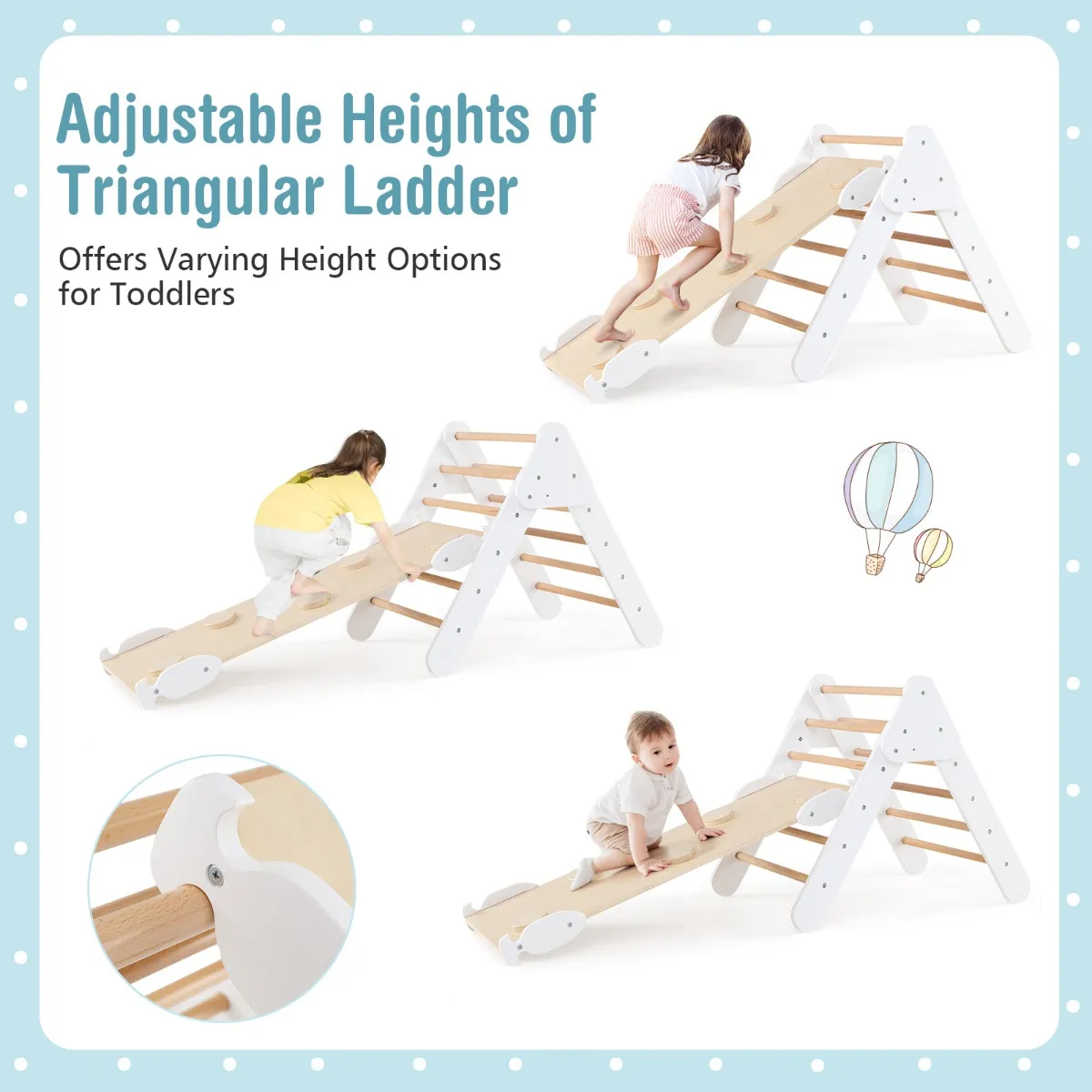 Laat kinderen verschillende soorten speelplezier beleven met deze houten klimdriehoekset!
