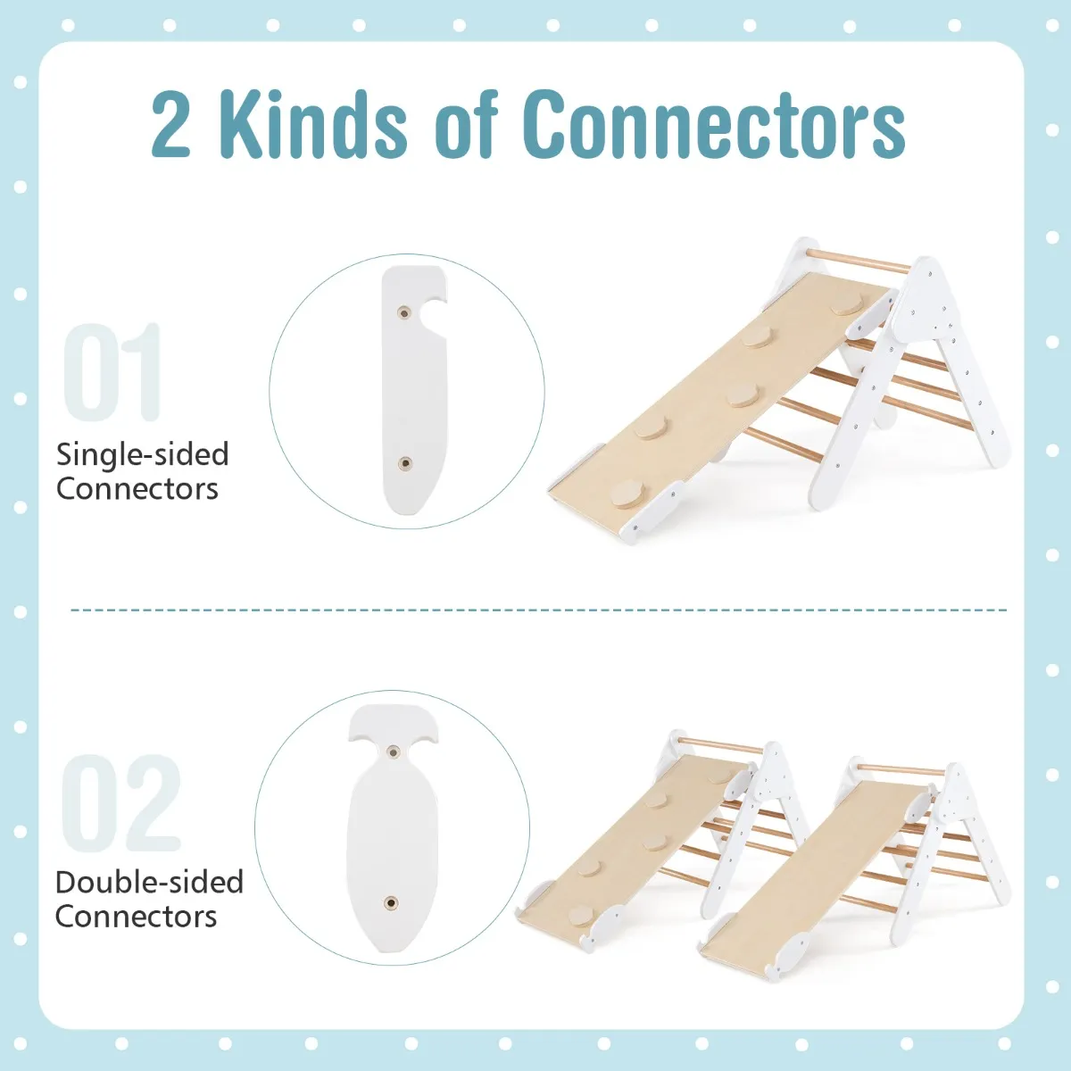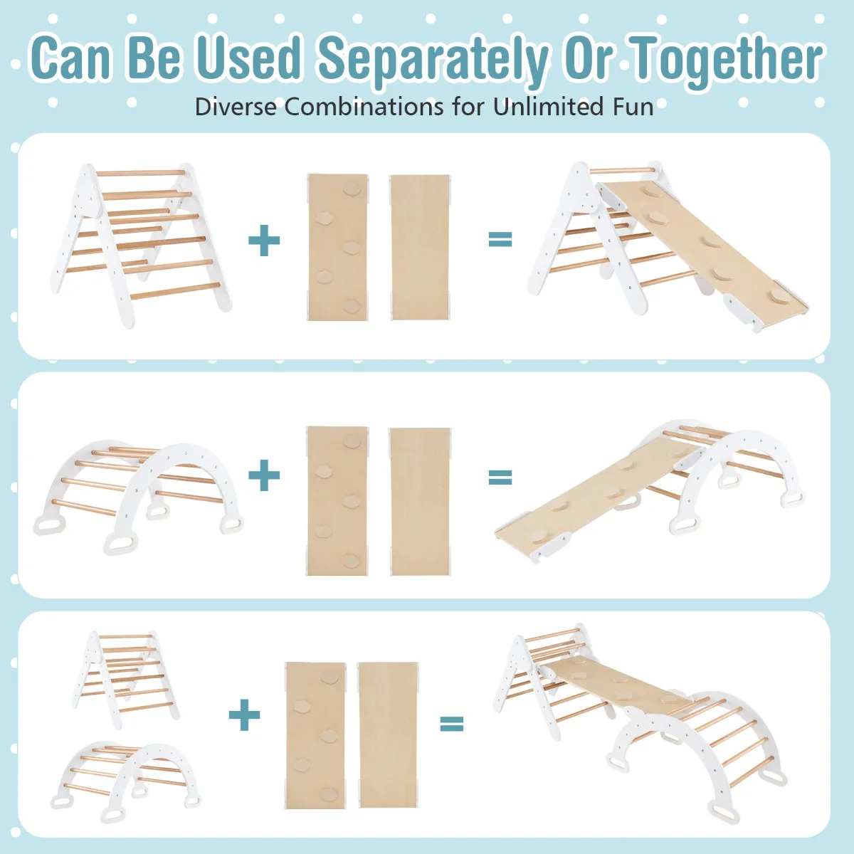 【2-in-1 klimhelling en boog】 De oprit heeft een dubbelzijdig ontwerp waardoor kinderen naar believen kunnen glijden of klimmen. Wanneer u de oprit combineert met de klimdriehoek, kunt u uw kinderen verschillende hoogtemogelijkheden bieden. Je kunt de klimboog ook omtoveren tot een wip door hem om te draaien.