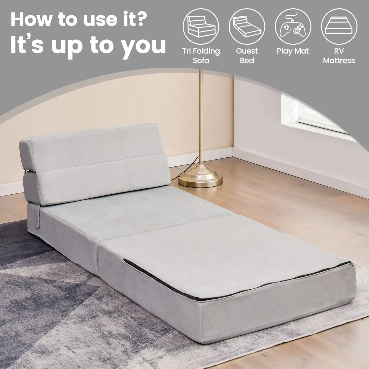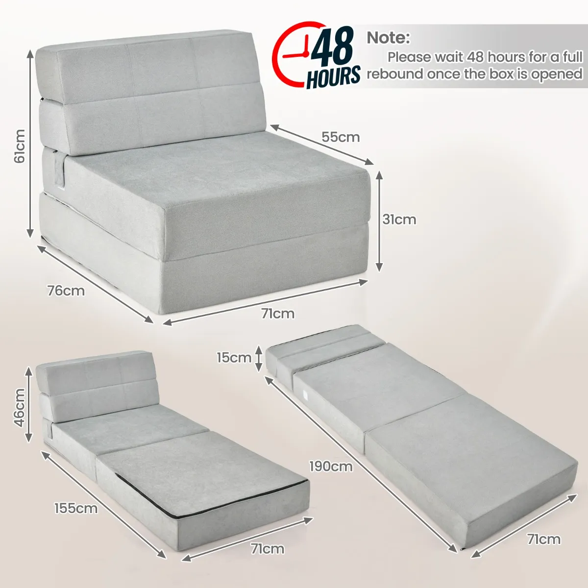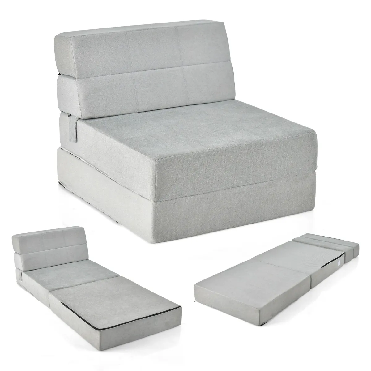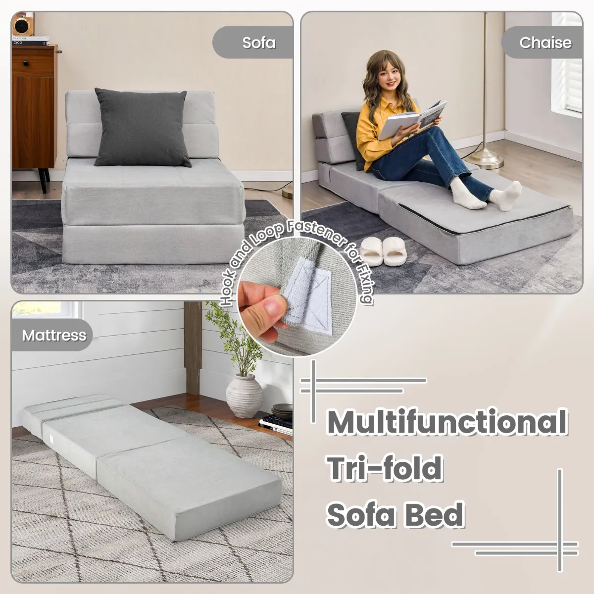 ÂVeelzijdige drievoudige slaapbank: De drievoudige slaapbank kan worden gebruikt als bank voor extra zitplaatsen. Bovendien kan de futonslaapbank worden omgebouwd tot een ligstoel door eenvoudigweg 2 delen uit te klappen en is hij ook een prima vloermatras voor logeerpartijtjes.
