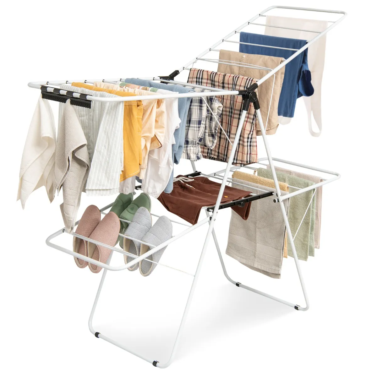 Onze opvouwbare droogtrommel is praktisch, volledig gemonteerd en gemakkelijk te gebruiken. De verstelbare vleugels en de grote droogruimte maken het gemakkelijk om lange kledingstukken of beddengoed op te hangen. De driehoekige structuur maakt het moeilijk om krom te trekken. Ons duurzame stalen rek is geschikt voor binnen- en buitengebruik om dekbedden, kussens en schoenen te drogen op het balkon of in de tuin. Je kunt het gebruiken als opbergrek in je slaapkamer of woonkamer en je kunt het na gebruik opvouwen en overal opbergen.