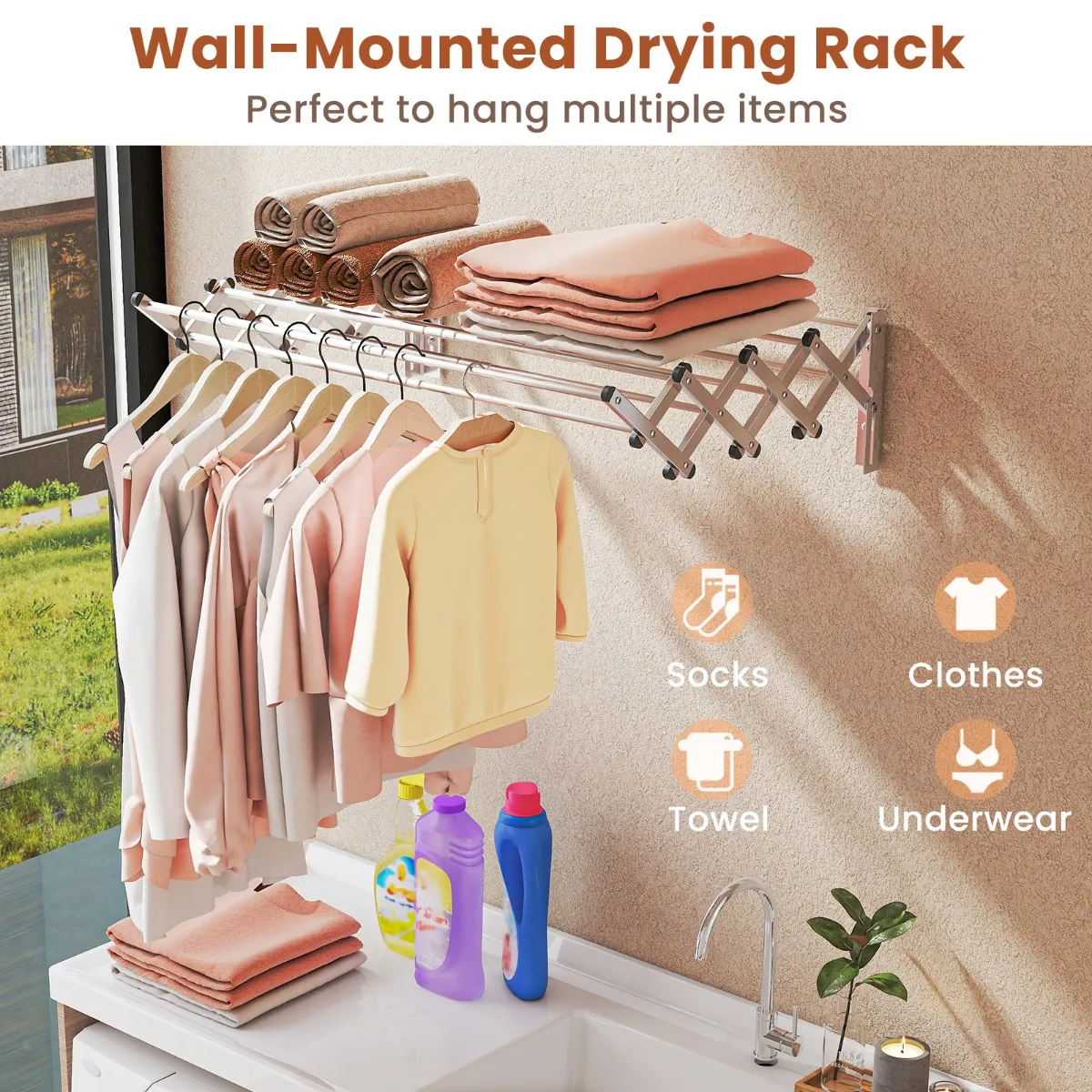 【Gemakkelijk te monteren】: Met de meegeleverde bevestigingsaccessoires kunt u deze wandwaslijn zonder veel moeite in elkaar zetten door de gedetailleerde instructies te volgen. Afmetingen wanneer volledig uitgeklapt: 86 x 64 x 22 cm (B x D x H).