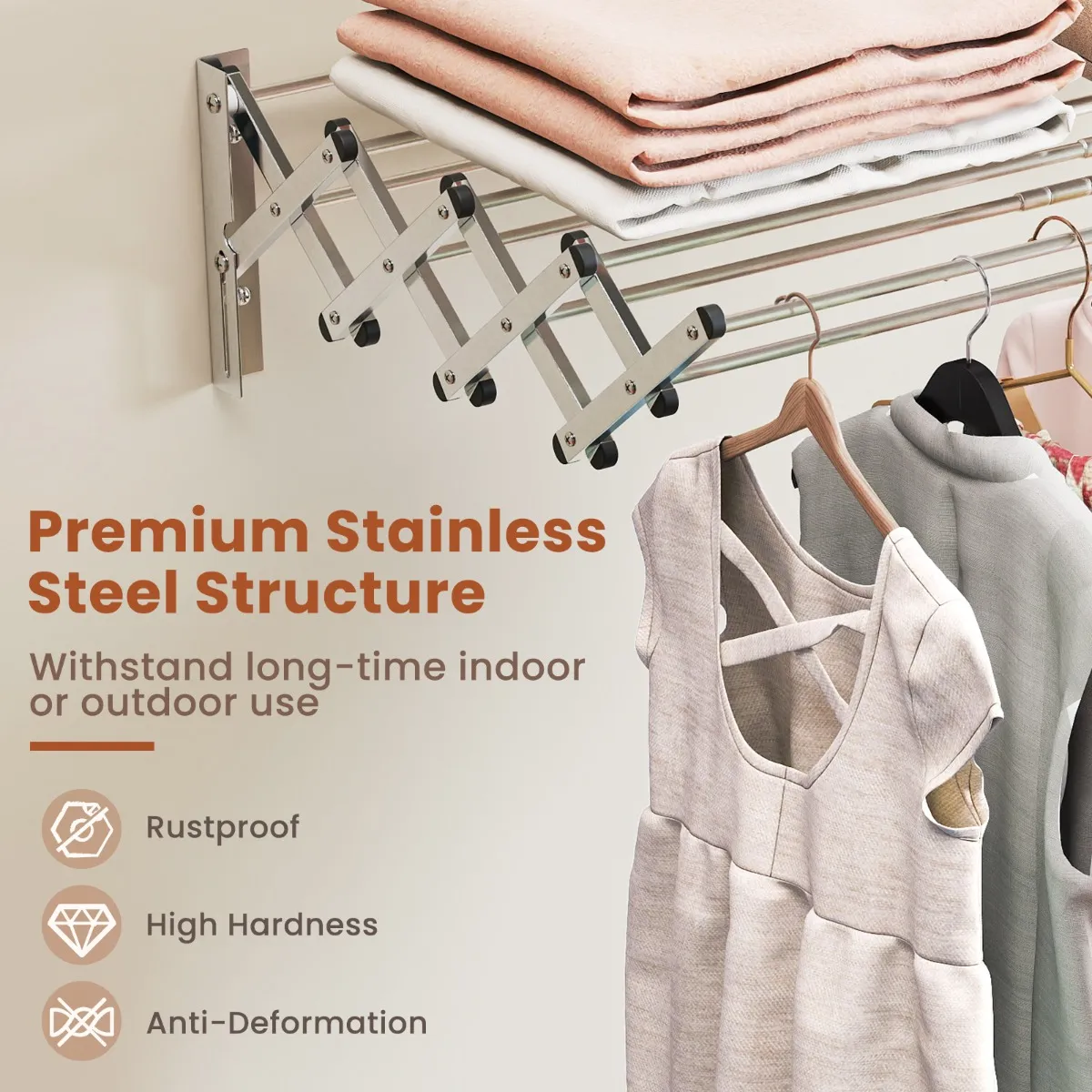 【Gebouwd om lang mee te gaan】: Allemaal gebouwd met zware roestvrijstalen buizen, zorgen deze droogrekken voor een sterke ondersteuning en trekken ze niet gemakkelijk krom. Niet alleen dat, ze zijn roestvrij en kunnen lange tijd dienst doen. De zwarte coating op de randen voorkomt dat er krassen op de kleding komen.