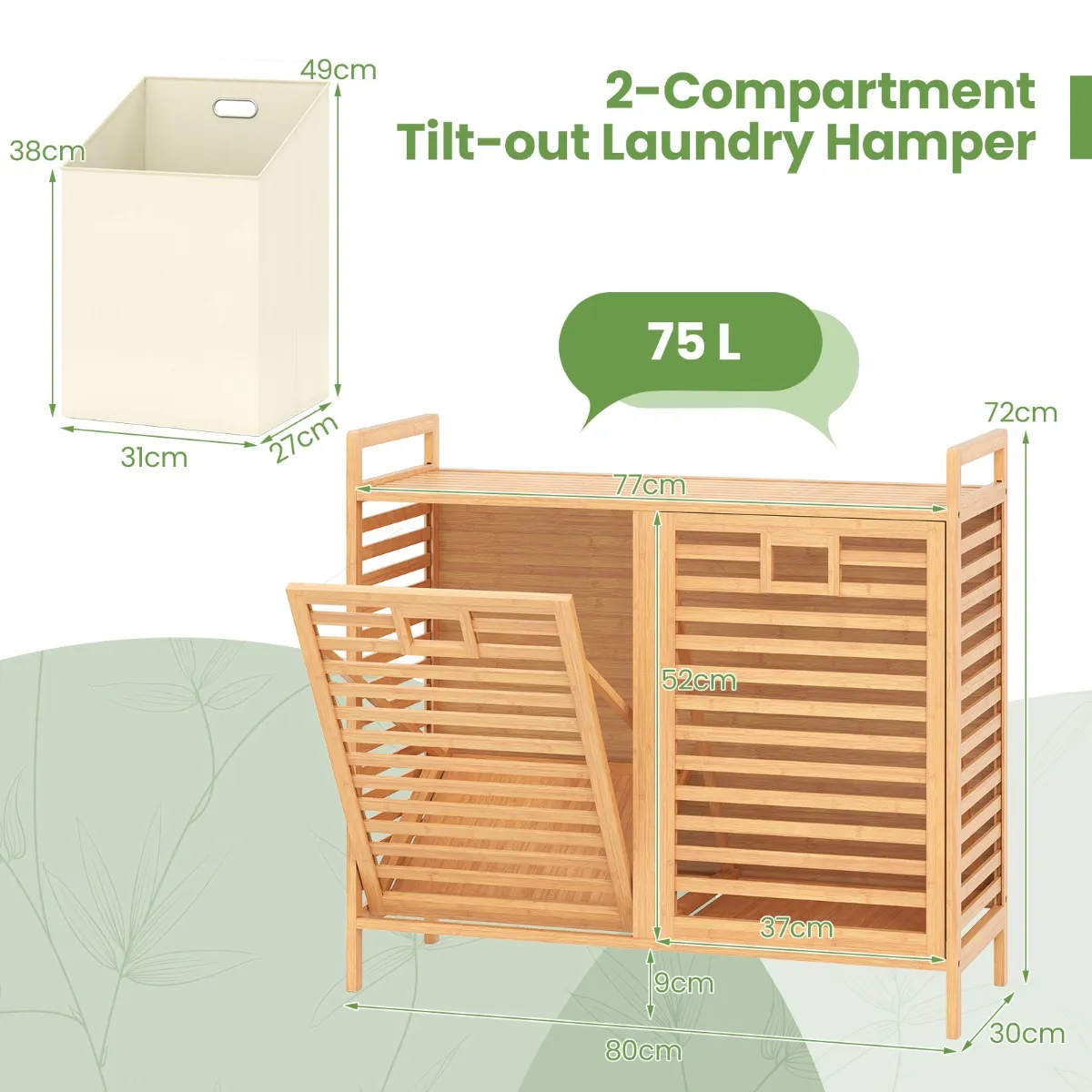 Met deze dubbel draaibare bamboe wasmand kunt u uw was in een handomdraai sorteren. Trek eenvoudig aan de manden om lichte en donkere was van elkaar te scheiden. De bovenste plank biedt handige opslagruimte voor wasbenodigdheden zoals wasmiddel of wasverzachter, precies daar waar u het nodig hebt.