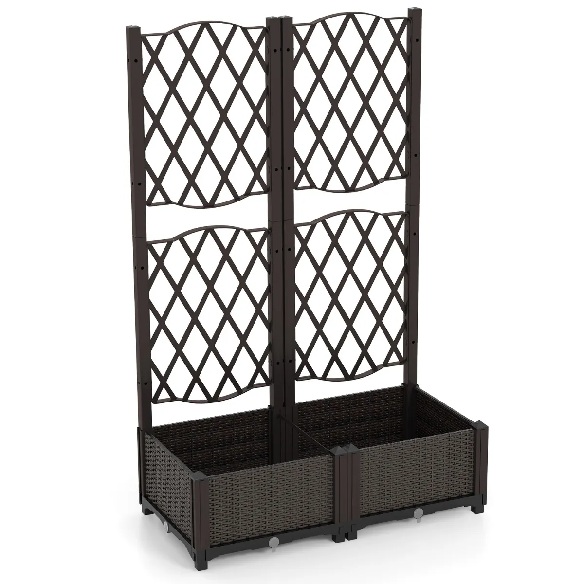 Deze plantenbak is gemaakt van versterkt PE-materiaal en is daardoor weerbestendig, kleurvast en heeft een rotan afwerking die naadloos bij elk tuindecor past. De zelfbewaterende schijf en de wateropslagplaat zorgen ervoor dat de planten gehydrateerd blijven zonder dat u ze dagelijks water hoeft te geven. De drainagegaten voorkomen bovendien wortelrot. Bovendien is de kas voorzien van een ruitvormig rooster voor klimplanten en biedt hij voldoende ruimte voor groenten, fruit of bloemen. Deze verhoogde tuinbak is breed toepasbaar op balkons, terrassen, tuinen, kassen en entrees en verfraait zowel binnen- als buitenruimtes.