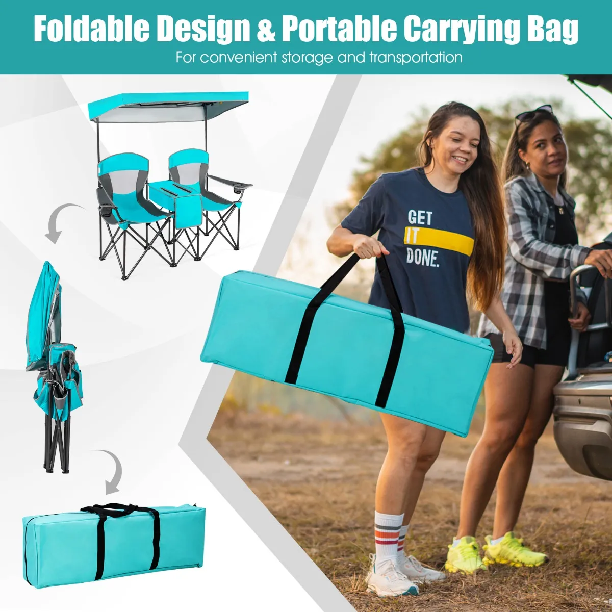 Opvouwbaar en draagbaar ontwerp: De stoelen kunnen binnen enkele seconden eenvoudig tot een compact formaat worden opgevouwen en u kunt de opvouwbare loveseat in de draagtas opbergen voor gemakkelijk opbergen en transporteren. Deze 2-zits buitenstoel is geschikt voor strand, camping, picknick, park, tuin, sportevenementen en meer, zodat u met uw geliefde van uw vrije tijd kunt genieten.
