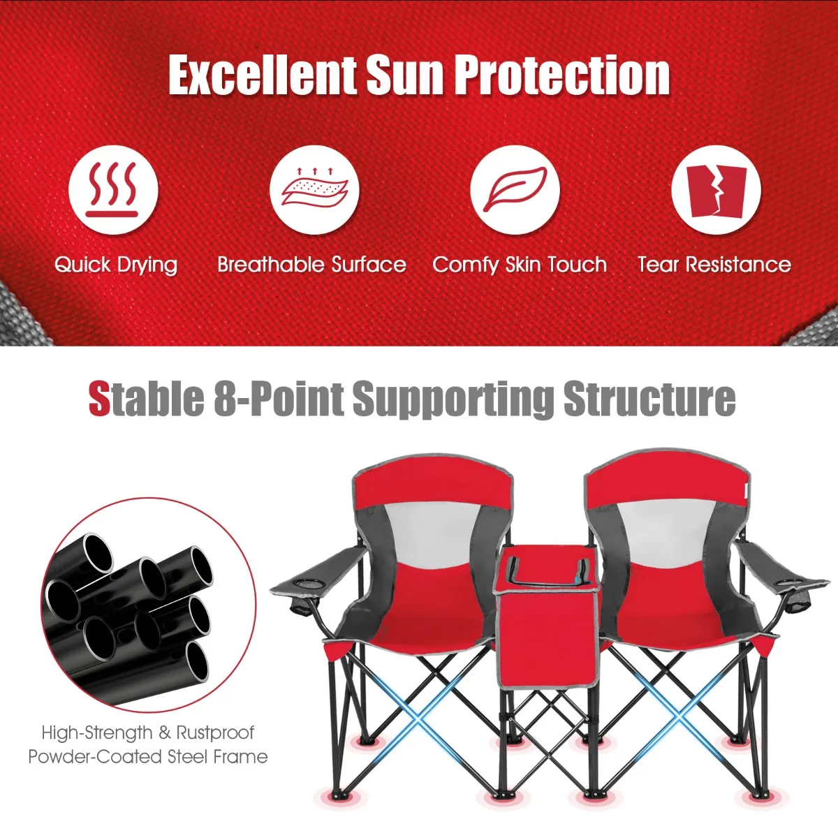 Onze 2-zitsstoel kan elk tot 120 kg dragen. Hij heeft een afneembare zonnekap met zilverkleurige coating die effectief zonlicht tegenhoudt, en de hoek kan worden ingesteld op 170° en worden losgemaakt. Het frame is gemaakt van roestbestendige metalen buizen met poedercoating om duurzaamheid te garanderen. De zitting is gemaakt van comfortabele, weerbestendige Oxford stof. In de middelste tafel zit een geïsoleerde zak die opbergruimte biedt. Hij kan worden opgevouwen en opgeborgen in de meegeleverde tas, om mee te nemen op kampeertrips, picknicks of naar het strand.