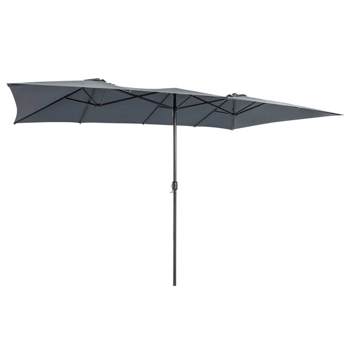 Onze 426 cm grote dubbelzijdige parasol biedt royale schaduw voor een zitgroep, zodat je met vrienden of familie in de mooie tuin, op het terras of terras kunt genieten. Dankzij de praktische zwengelgreep kun je de parasol gemakkelijk openen of sluiten door aan de handgreep te draaien. Bovendien bestaat de parasoldoek uit hoogwaardig polyesterstof met PA-coating, die regenbestendig, zonwering, warmte-isolerend is en betere bescherming buitenshuis biedt. Bovendien wordt de parasoldoek ondersteund door een gepoedercoate metalen structuur met 10 ribben, die voor uitstekende stabiliteit en uitstekende roestbestendigheid zorgt. Of het nu voor privé- of commercieel gebruik is, onze grote dubbelzijdige parasol kan een perfecte keuze zijn.