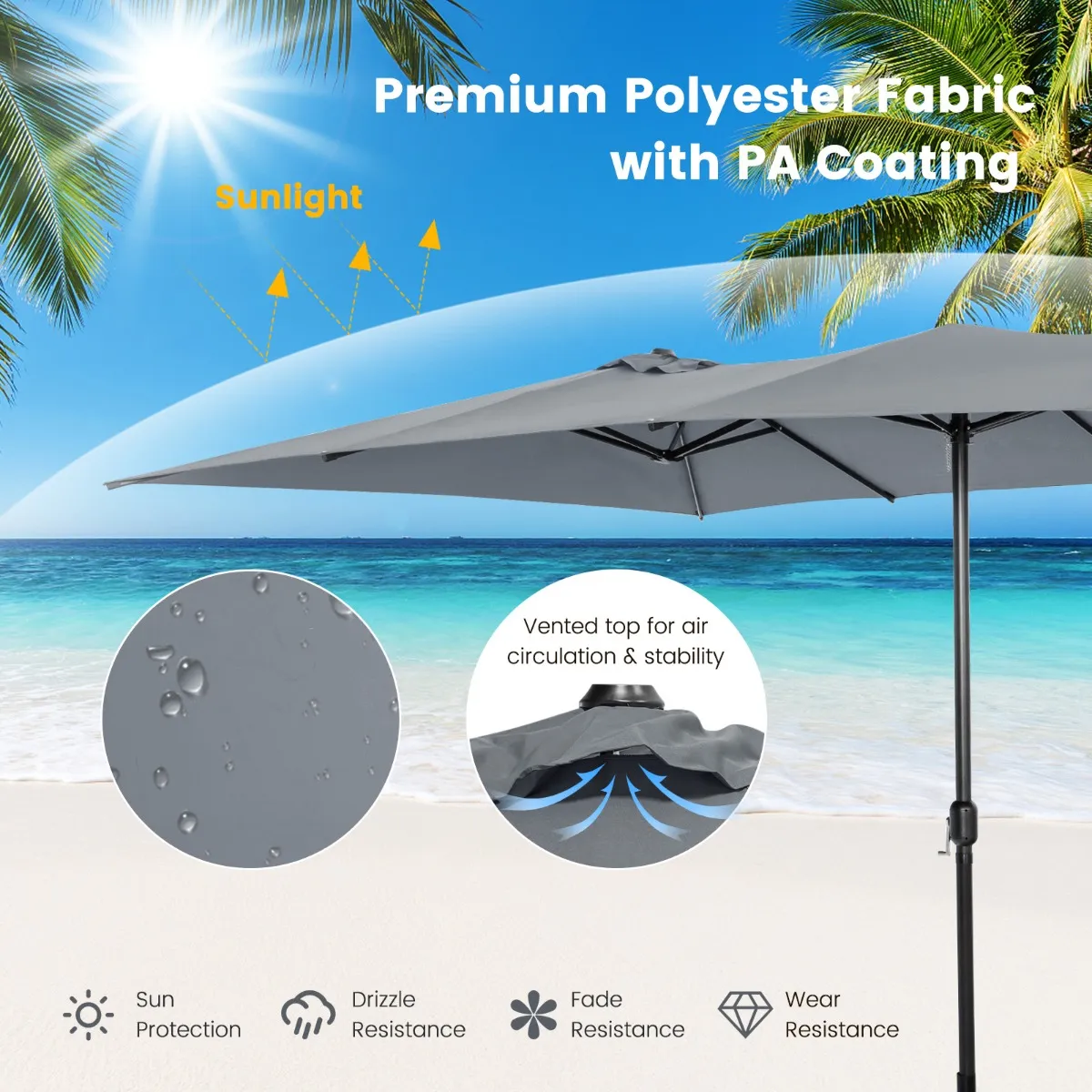 Premium materiaal en geventileerde top:Â De luifel bestaat uit hoogwaardig polyester met PA-coating, die wordt gekenmerkt door zonwering, spatbestendigheid, kleurechtheid en slijtvastheid en garant staat voor een langdurig gebruik buitenshuis. Bovendien beschikt hij over geventileerde tops, die voor voldoende luchtstroom zorgen en de stabiliteit verbeteren.