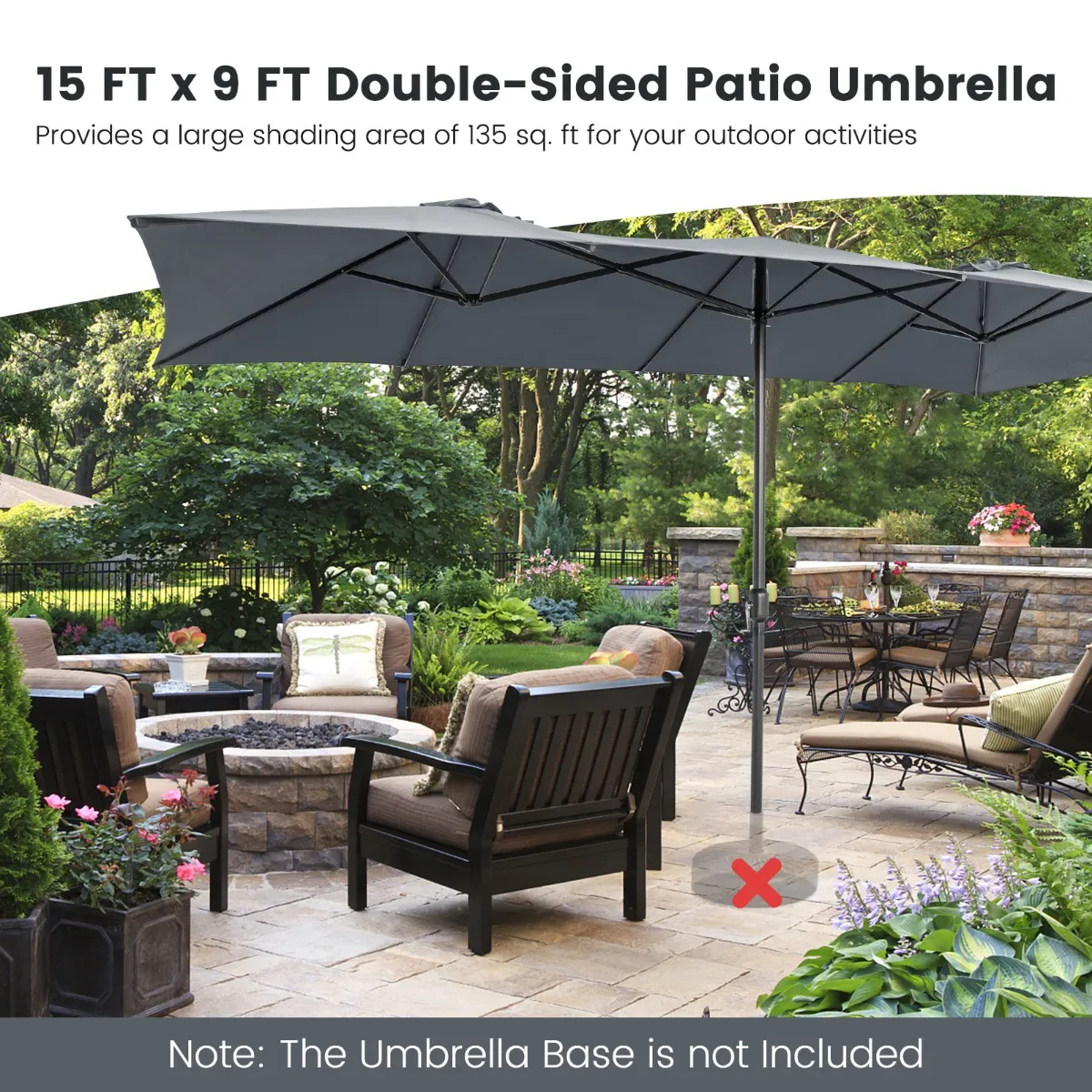 Opmerking: De parasolstandaard is niet inbegrepen en wij raden een verzwaarde basis (niet inbegrepen) aan om de parasol voor een betere windbestendigheid te fixeren. Je kunt hem ook gebruiken met een tafel of een zijdelingse terrasmeubelset. Sluit de parasol op winderige of regenachtige dagen om de levensduur te verlengen.
