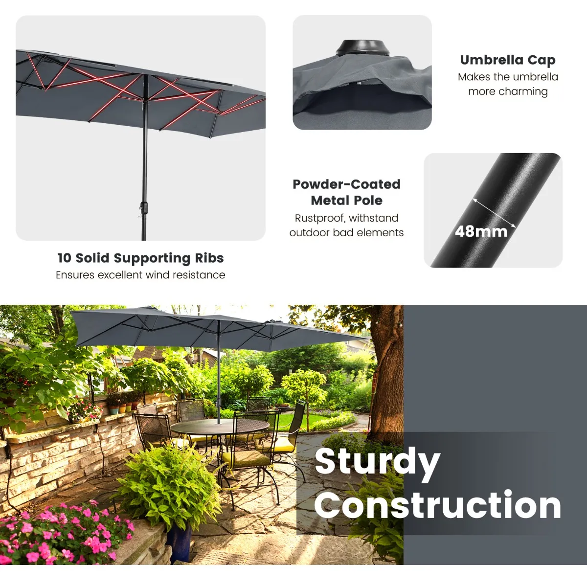Zwengelmechanisme voor eenvoudige bediening:Â De dubbele parasol beschikt over een moeiteloos zwengelbesturingsmechanisme, waarmee je de parasol moeiteloos kunt openen of sluiten. De metalen steunpool kan in twee delen worden gedemonteerd voor een comfortabele opslag wanneer hij niet in gebruik is.