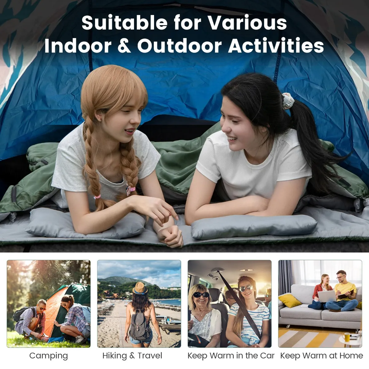 【GEMAAKT VOOR EXTREEM WEER】onze dubbele slaapzakken zijn ontworpen voor temperaturen onder het vriespunt, het kan je warm en gezellig houden, zelfs als het 0°C- 15°C is. Bovendien hebben onze slaapzakken een waterdicht, weerbestendig ontwerp en voorkomen ze dat je vocht krijgt – dit wordt bereikt door dubbel gevulde technologie en S-vormig gewatteerd ontwerp.