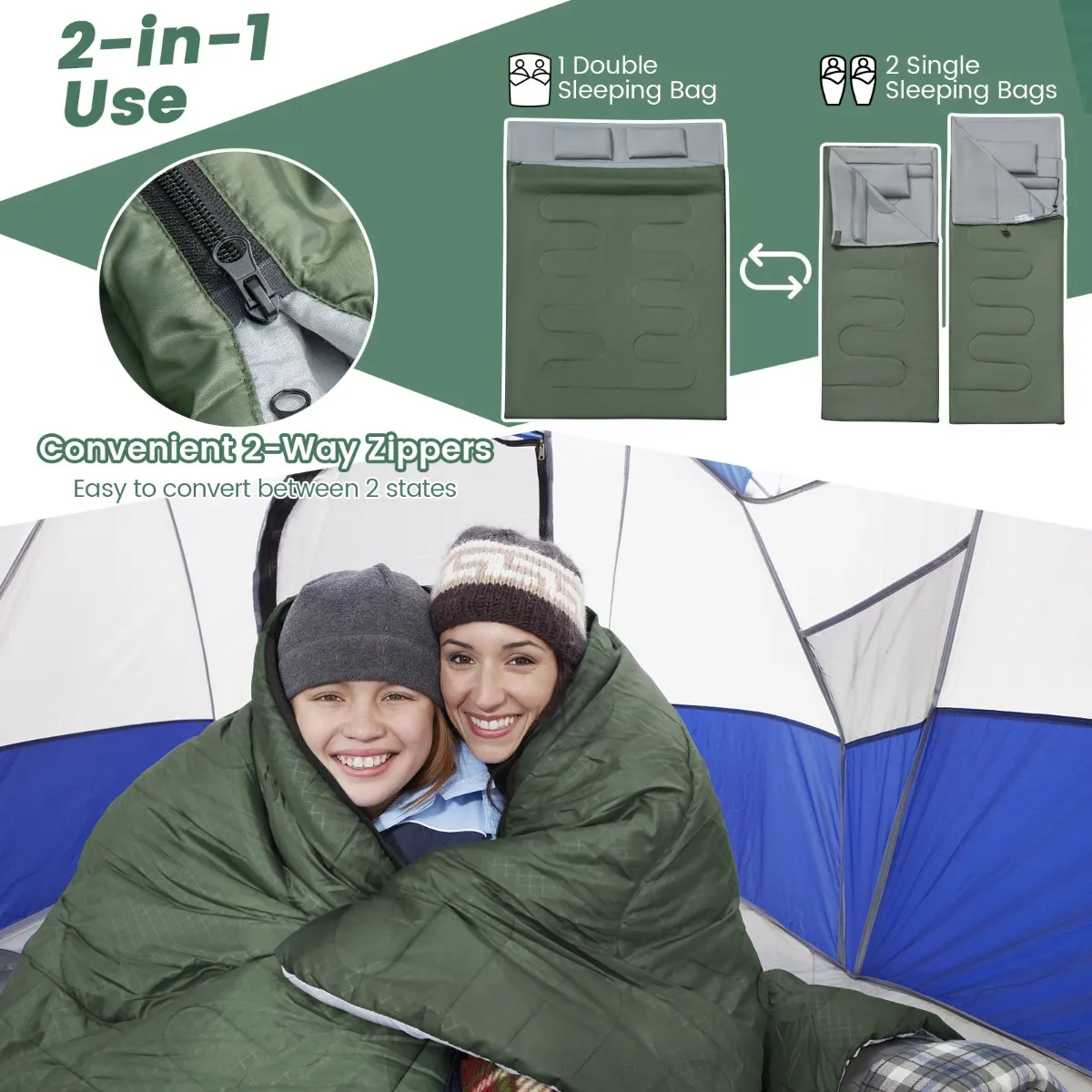 【2 IN 1 MULITIFUNCTIONEEL GEBRUIK】 Onze slaapzak is ontworpen om te worden gebruikt als een grote slaapzak en kan indien nodig ook worden opgedeeld in twee individuele slaapzakken. Ritsen aan beide zijden voor gemakkelijk in- en uitstappen. Speciaal ontworpen extra binnenvakken voor opslag om uw reis / buitenavontuur net iets gemakkelijker te maken.