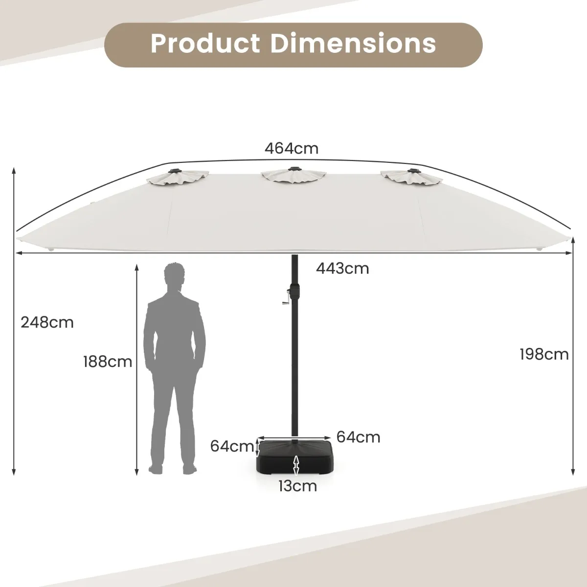 • Buitenafmetingen van de parasol: 464 x 286 cm (B x H)
